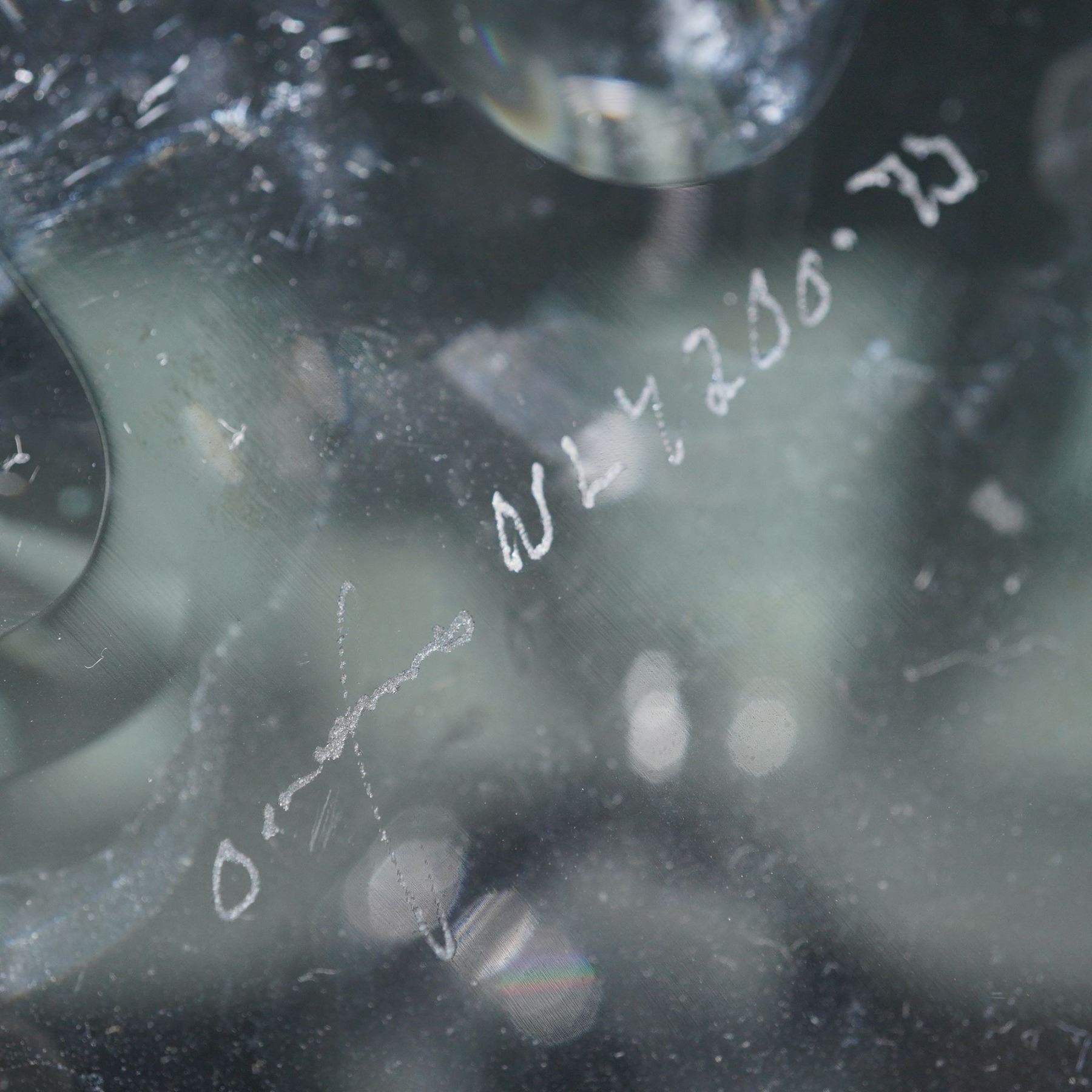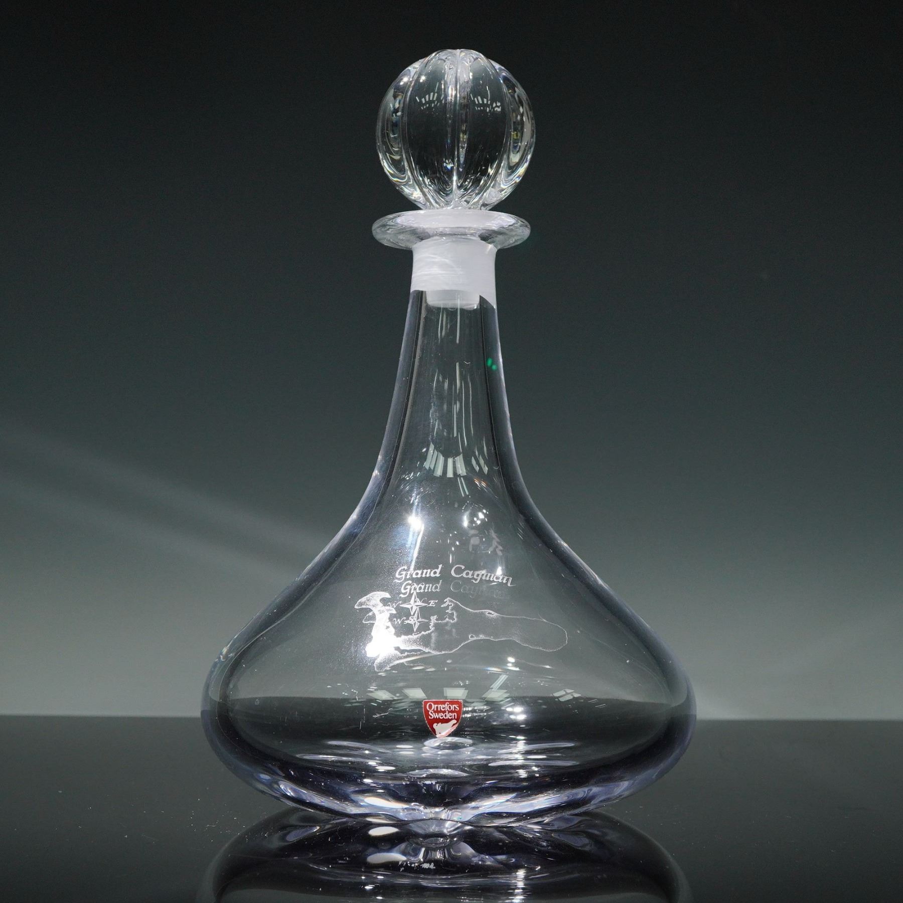 A distinguished crystal decanter of teardrop form, accentuated by a faceted spherical stopper of remarkable clarity and precision. The surface bears an engraved depiction of Grand Cayman, accompanied by the island's name in graceful script. "NL 7200" etched to the underside. Orrefors etched backstamp. Orrefors sticker label.