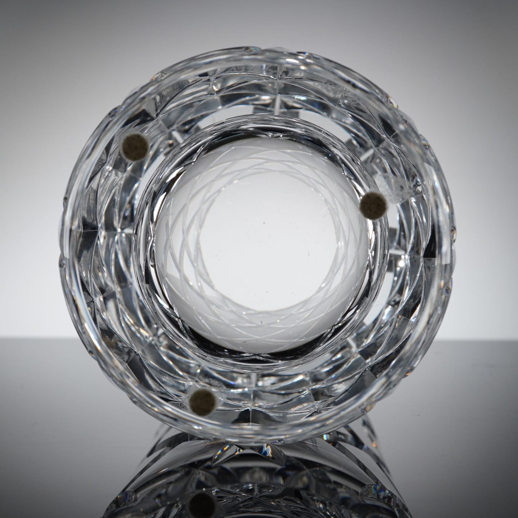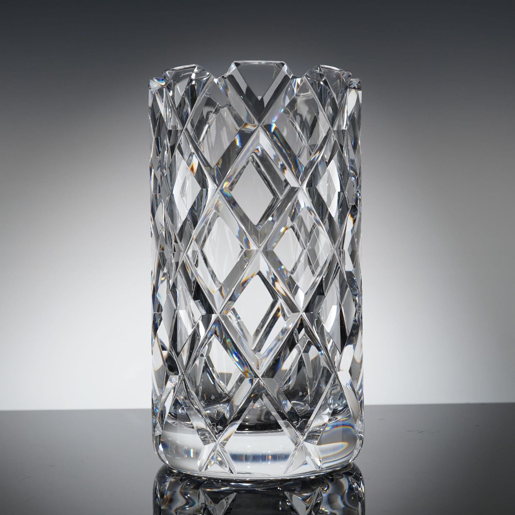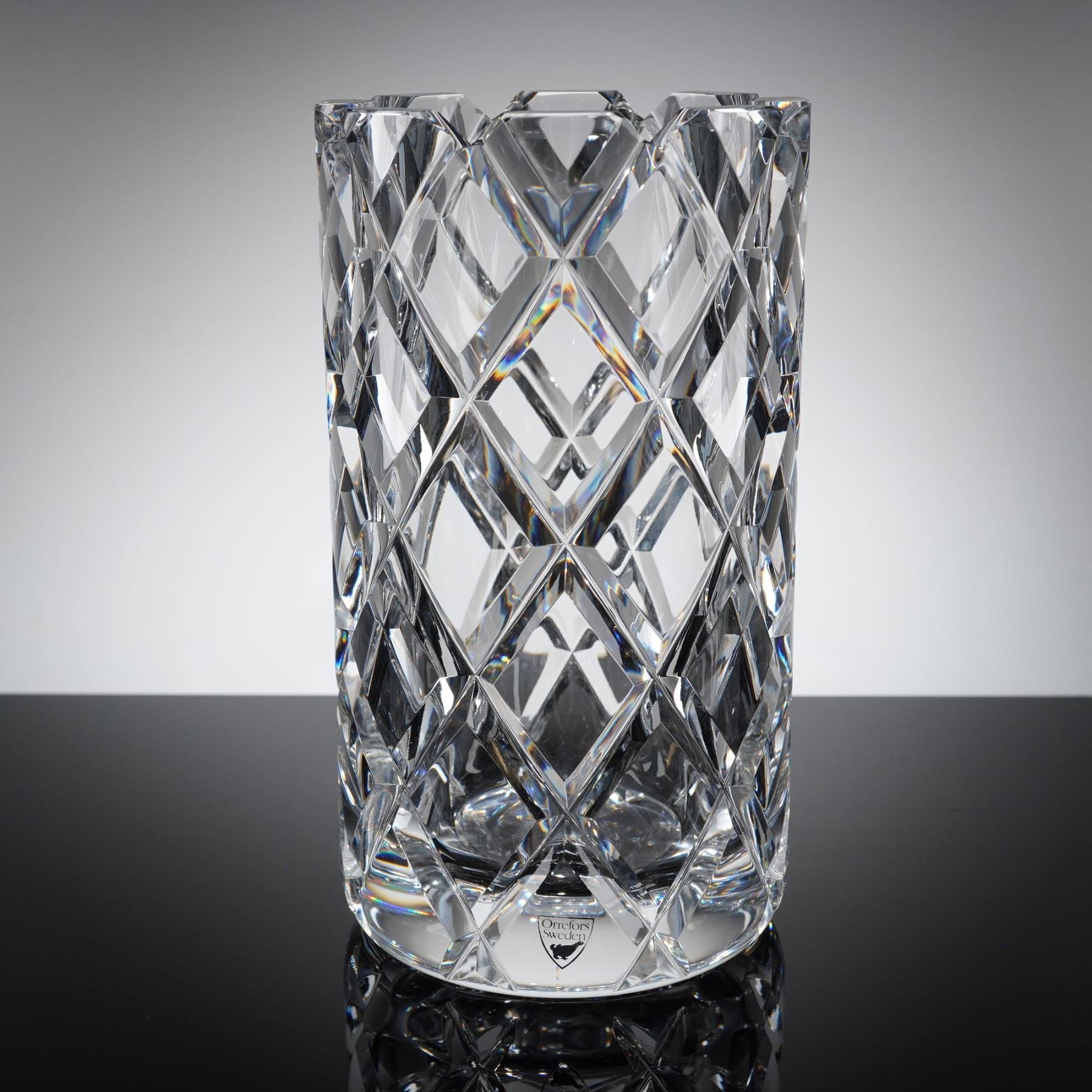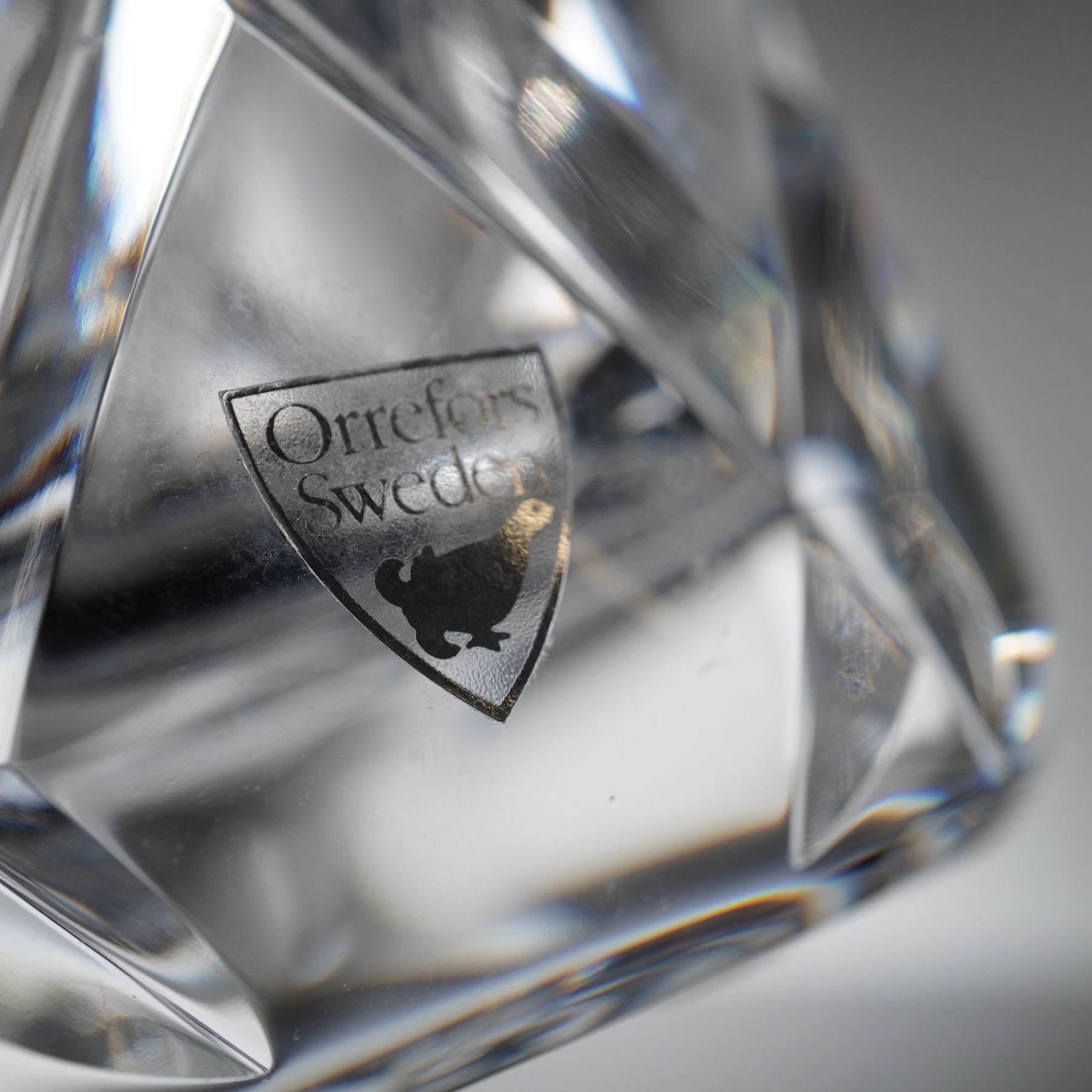 The vase is constructed of heavy, crystal and features deep, angular, geometric faceting characteristic of modern Scandinavian design. The form suggests a wide, shallow bowl. Affixed directly to one of the facets is the original shield-shaped foil label, black with gold letering, reading "Orrefors Sweden" and displaying the silhouete logo of the glassworks.