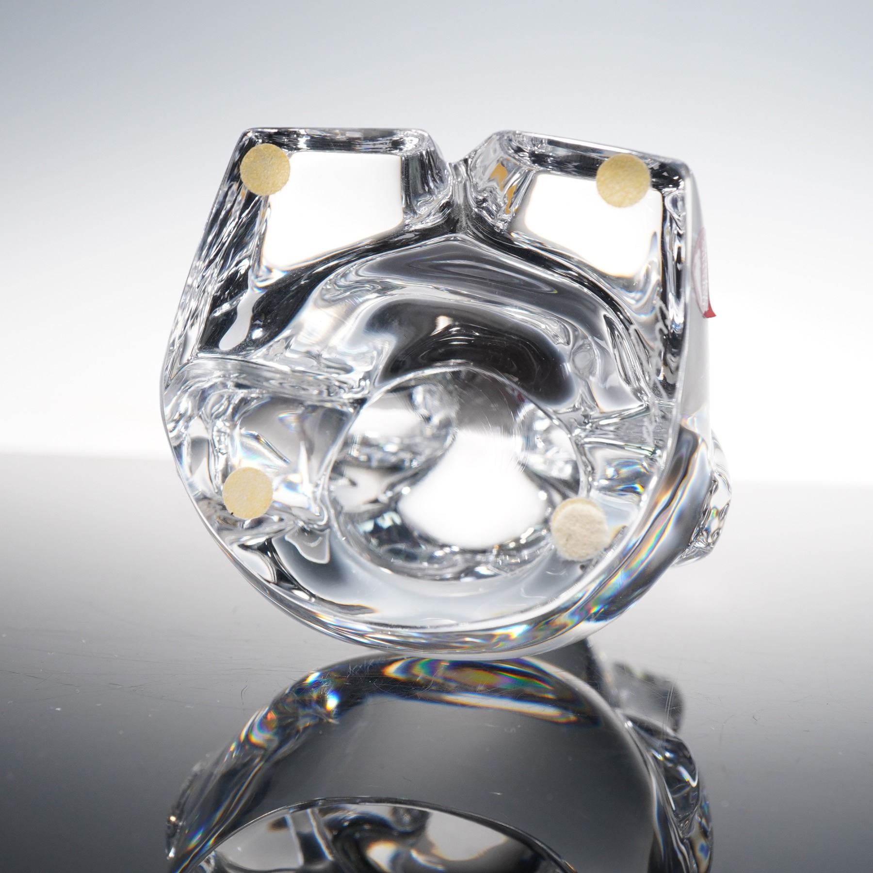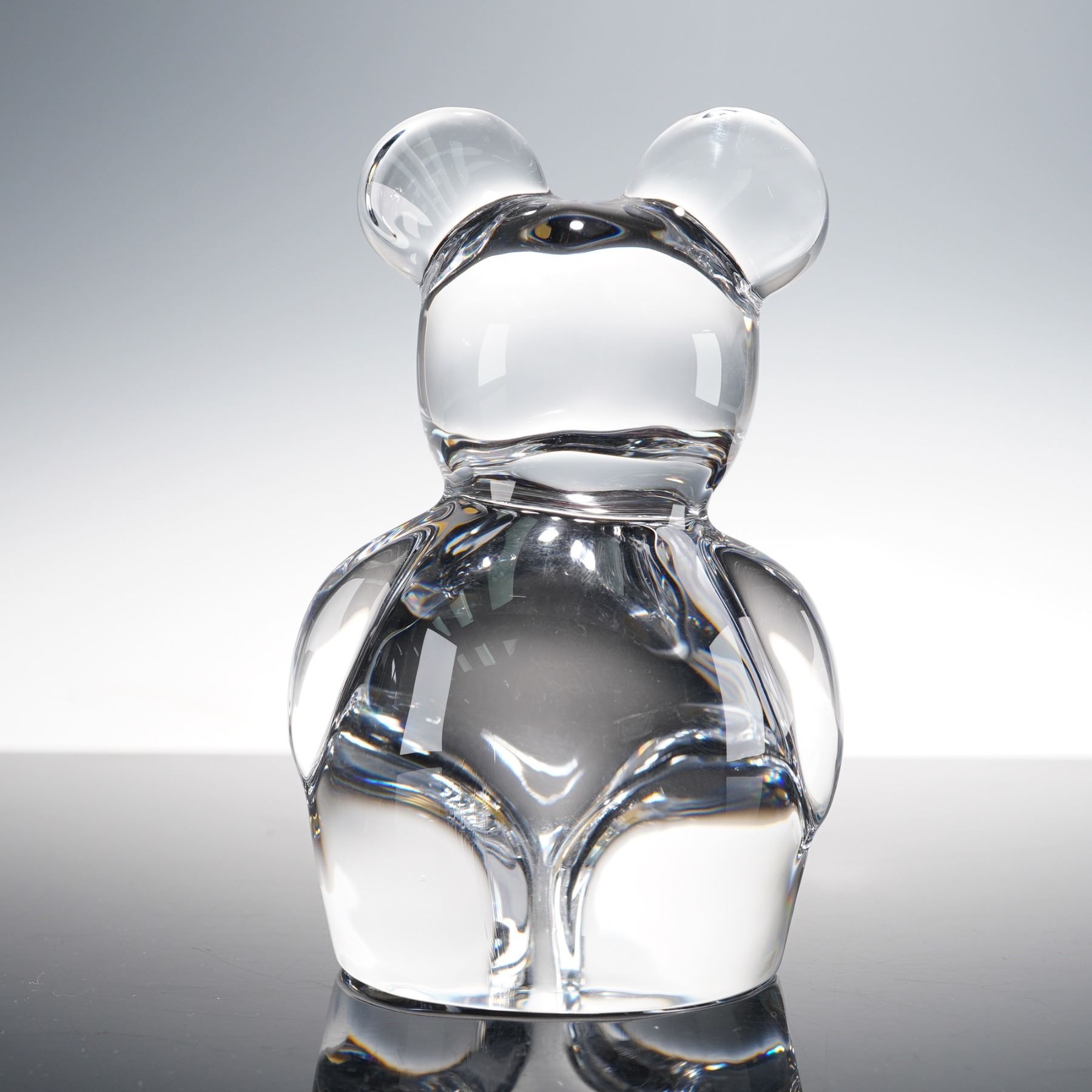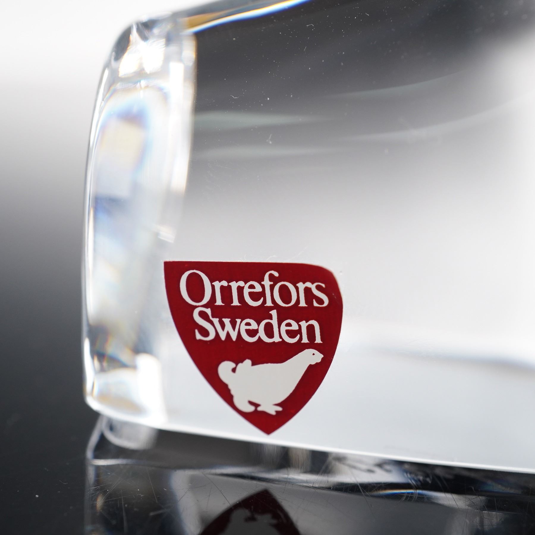 Charming crystal teddy bear paperweight by Orrefors, Sweden. Crafted in clear lead crystal with smooth contours and an expressive modernist form. Retains original red Orrefors Sweden label and is etched Orrefors on the base.