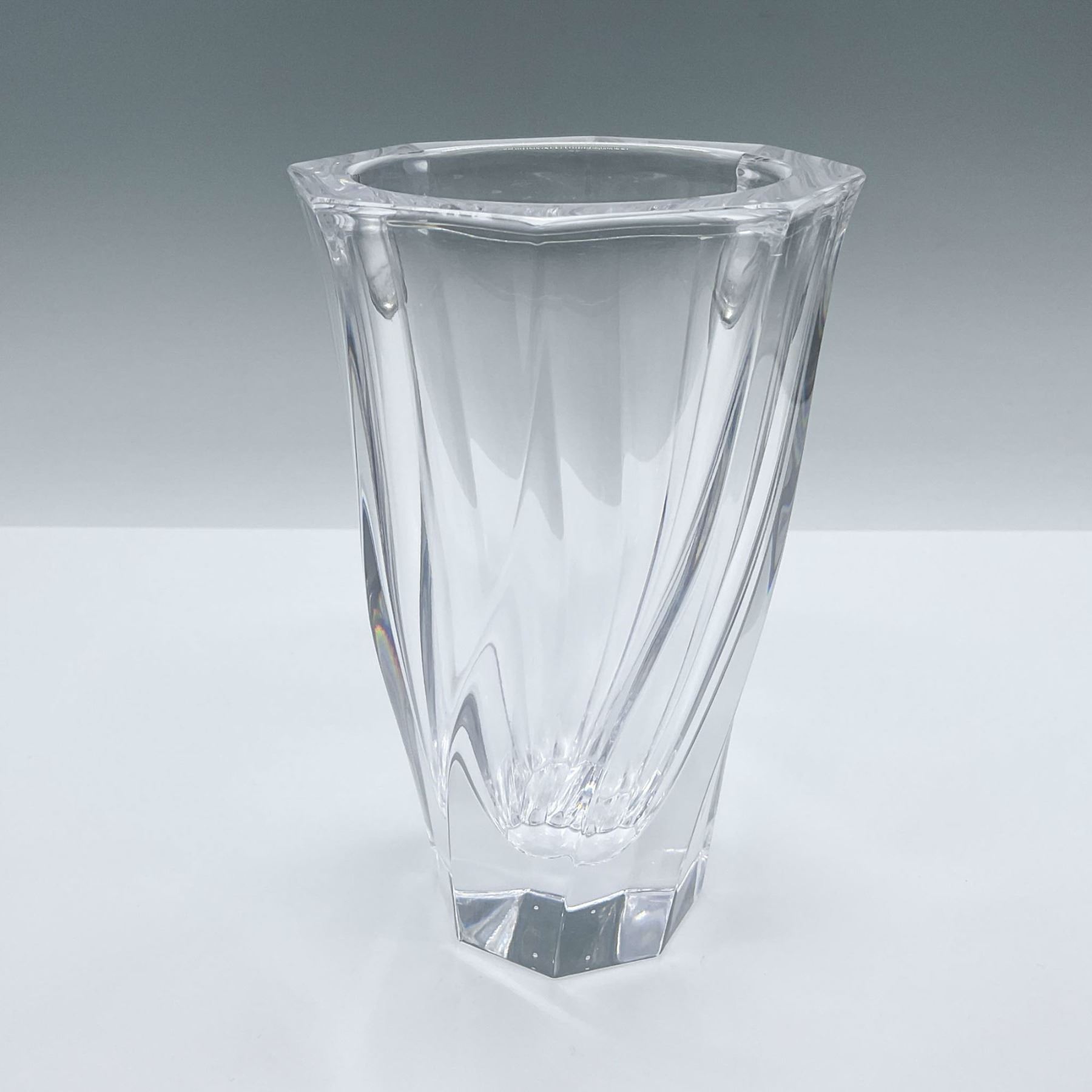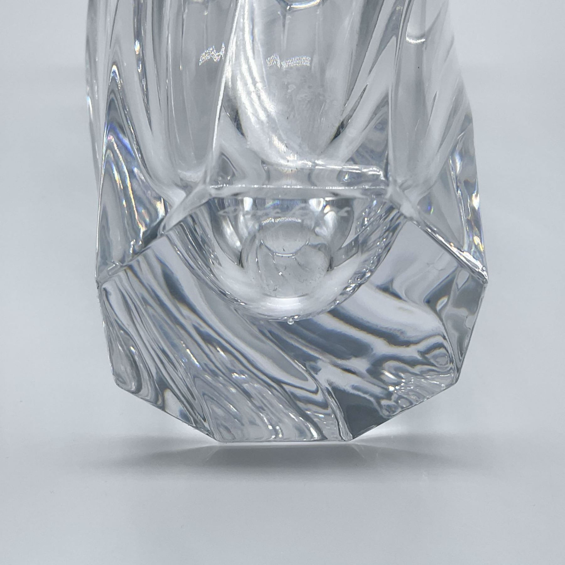 A clear flower vase with a swirl body. Orrefors marked on the underside.