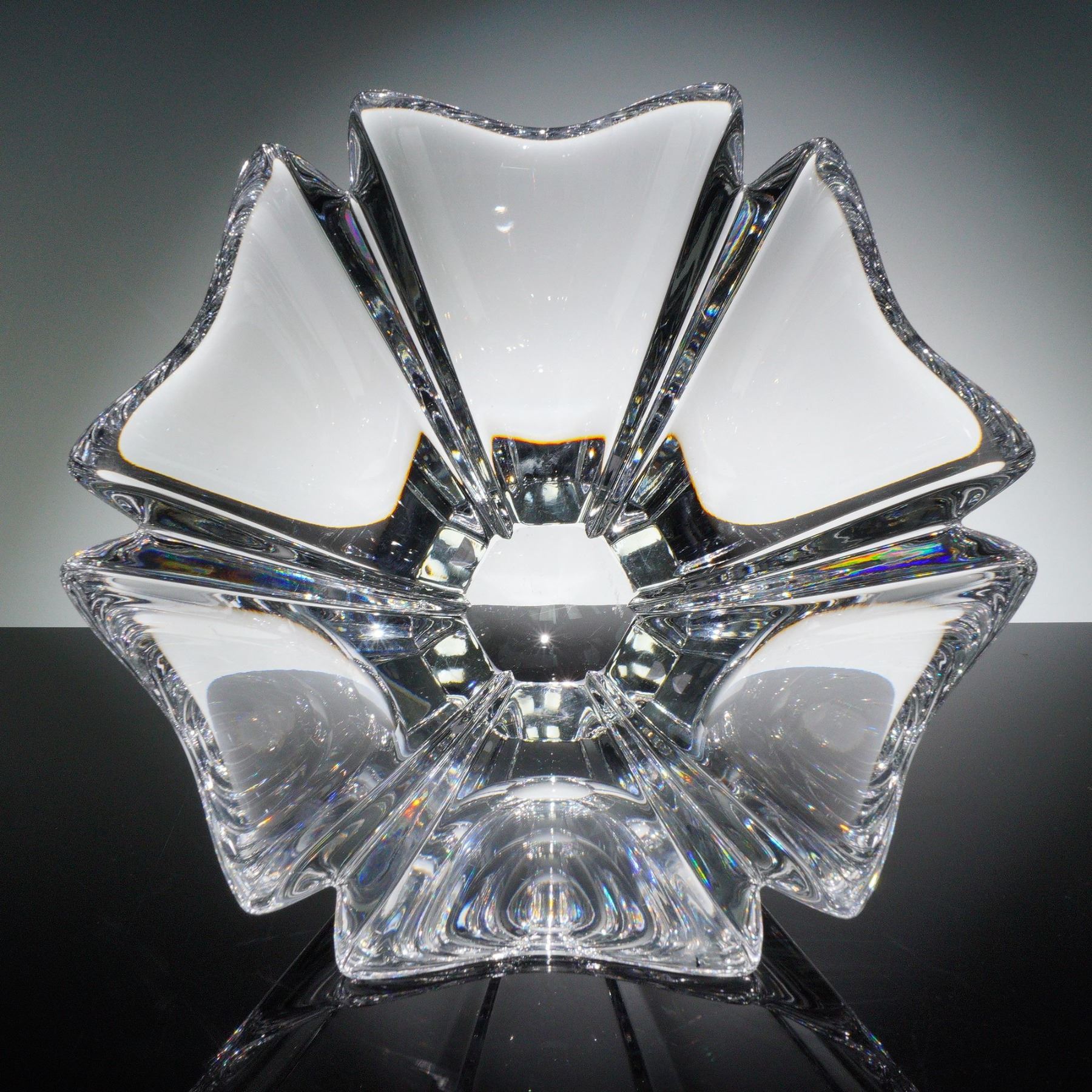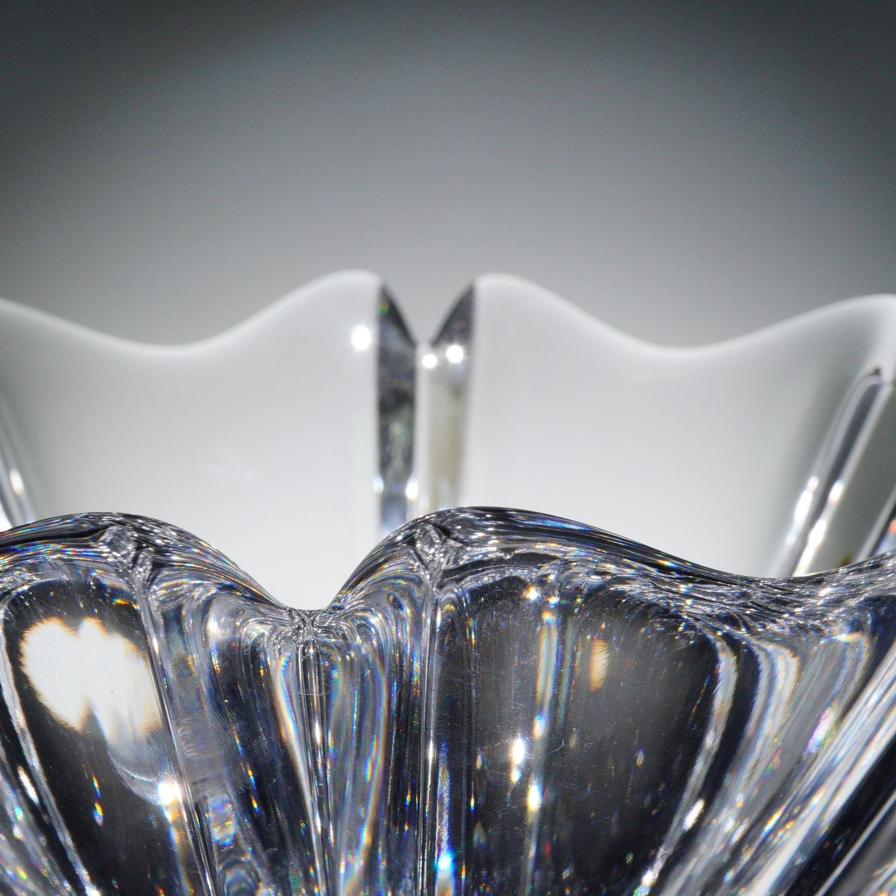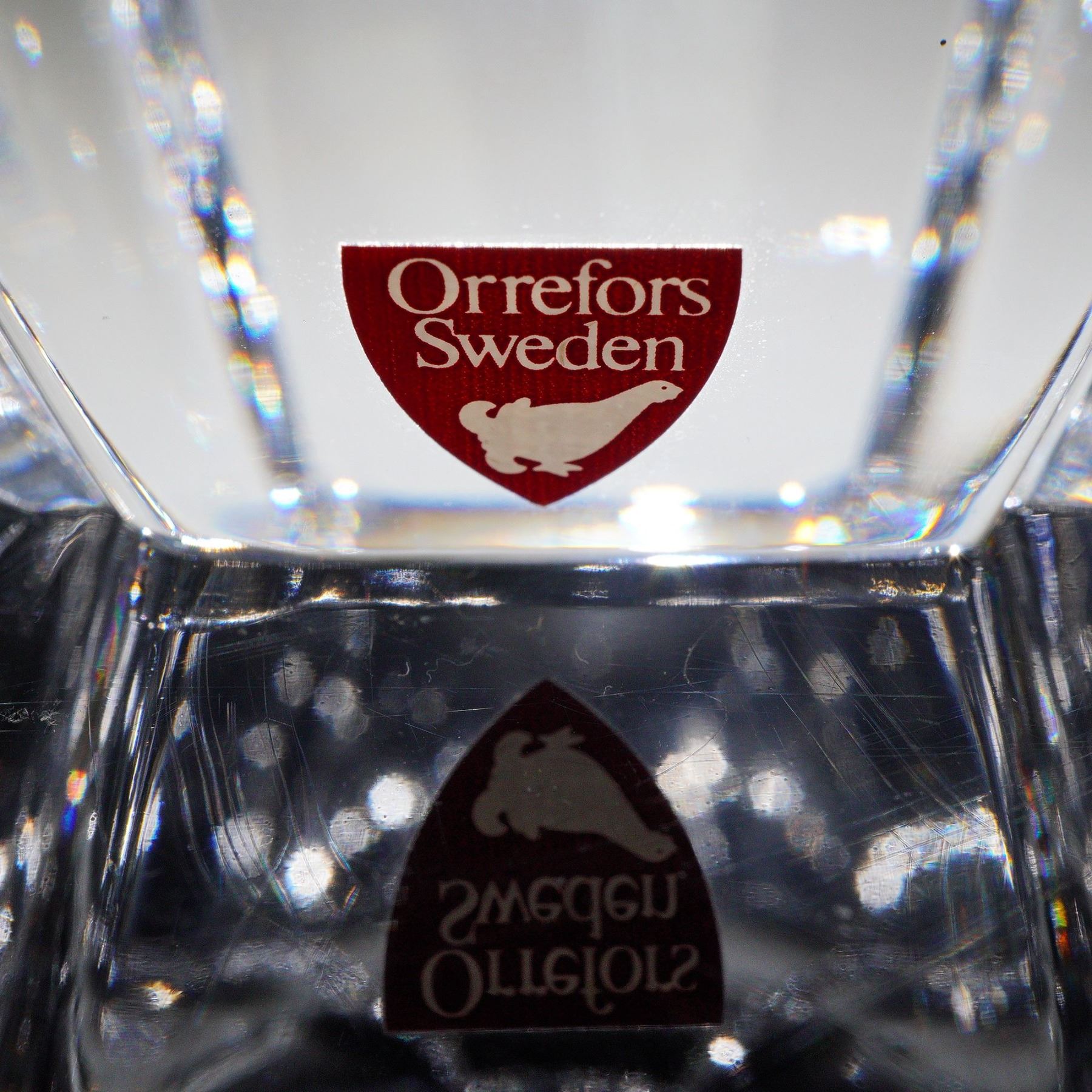 The bowl features gracefully flared petal-like panels that create a floral silhouette, expertly cut and polished to showcase brilliant refraction and clarity. Retains the original Orrefors red foil label and is etched-signed Orrefors along the base. This sculptural Scandinavian crystal piece exemplifies the timeless beauty and craftsmanship for which Orrefors is renowned.