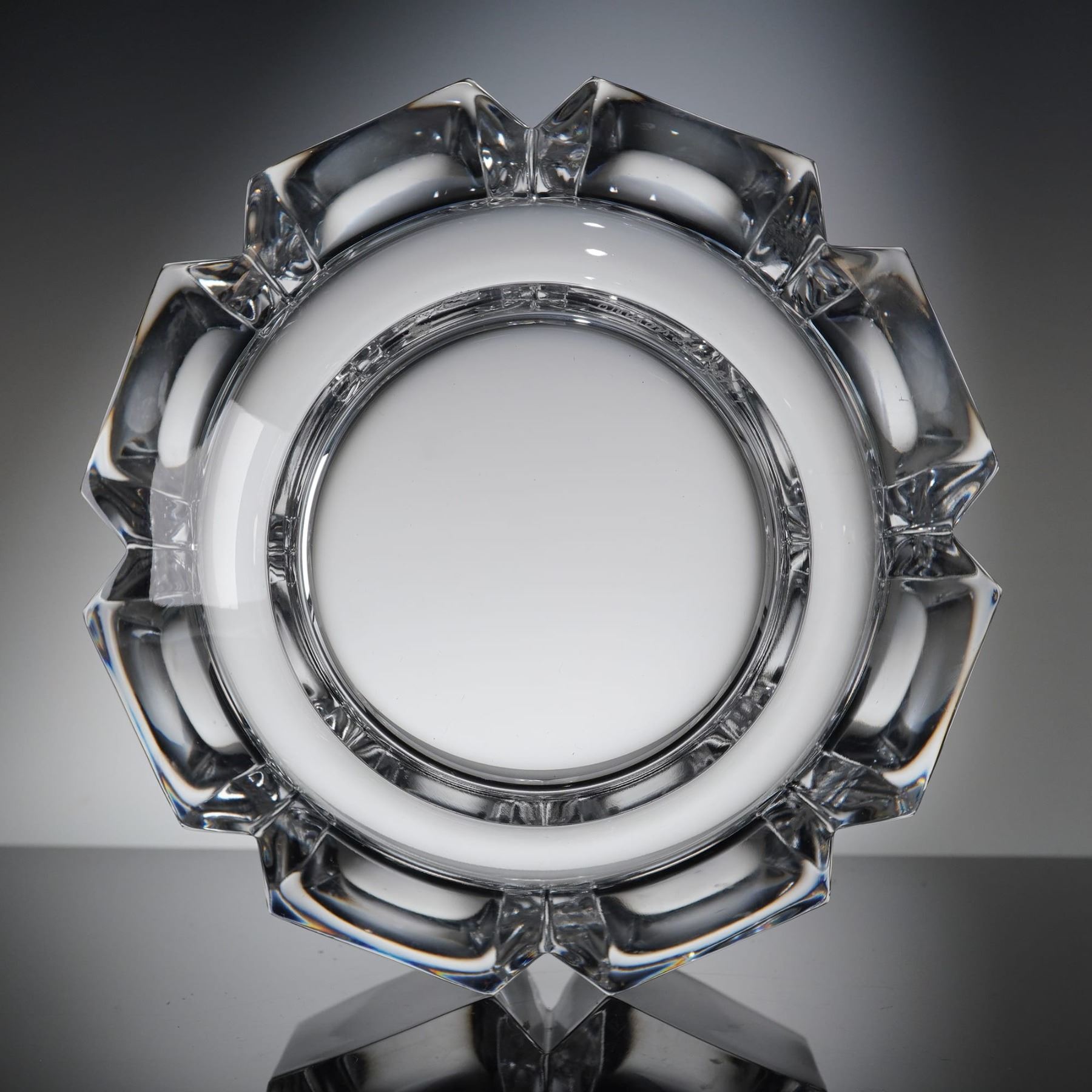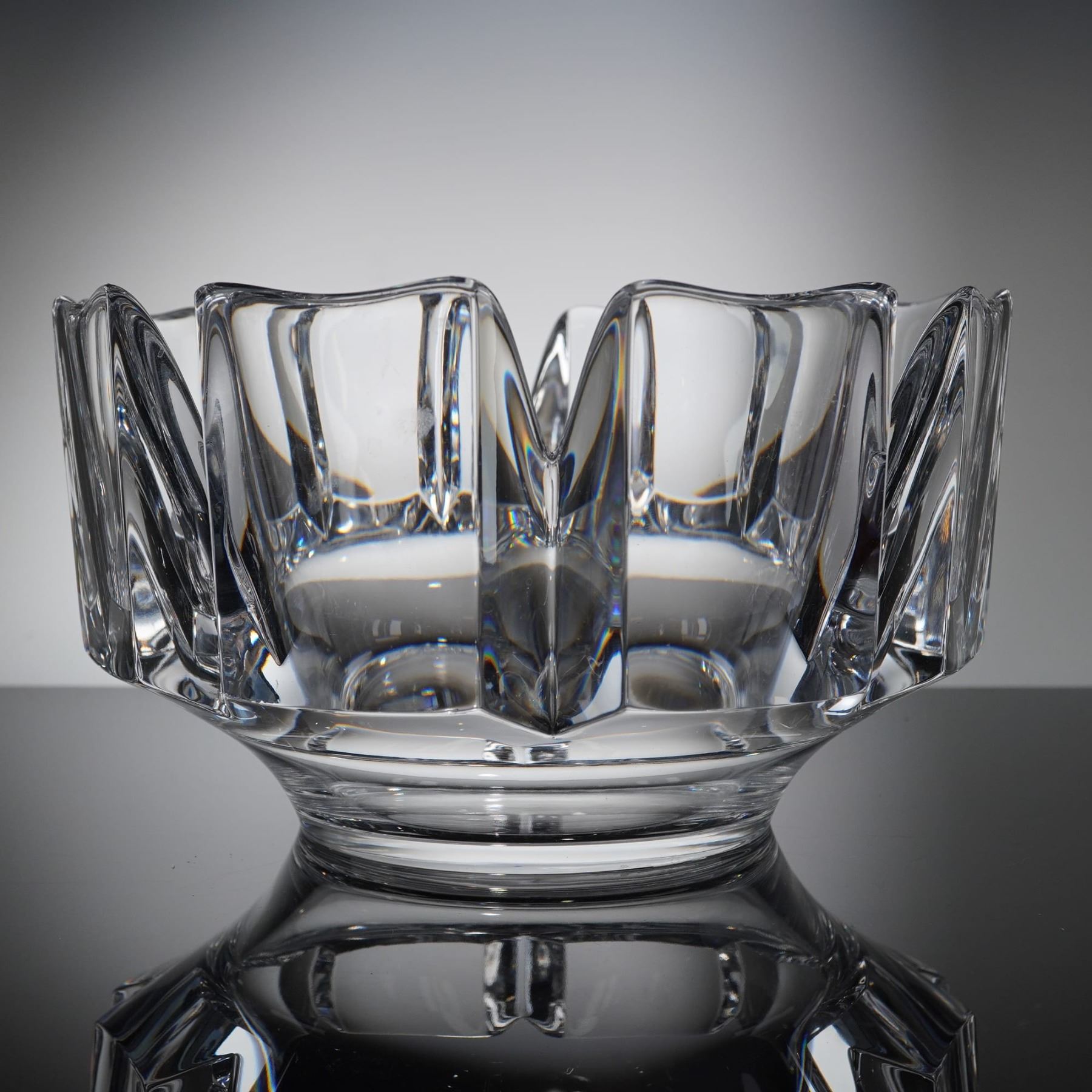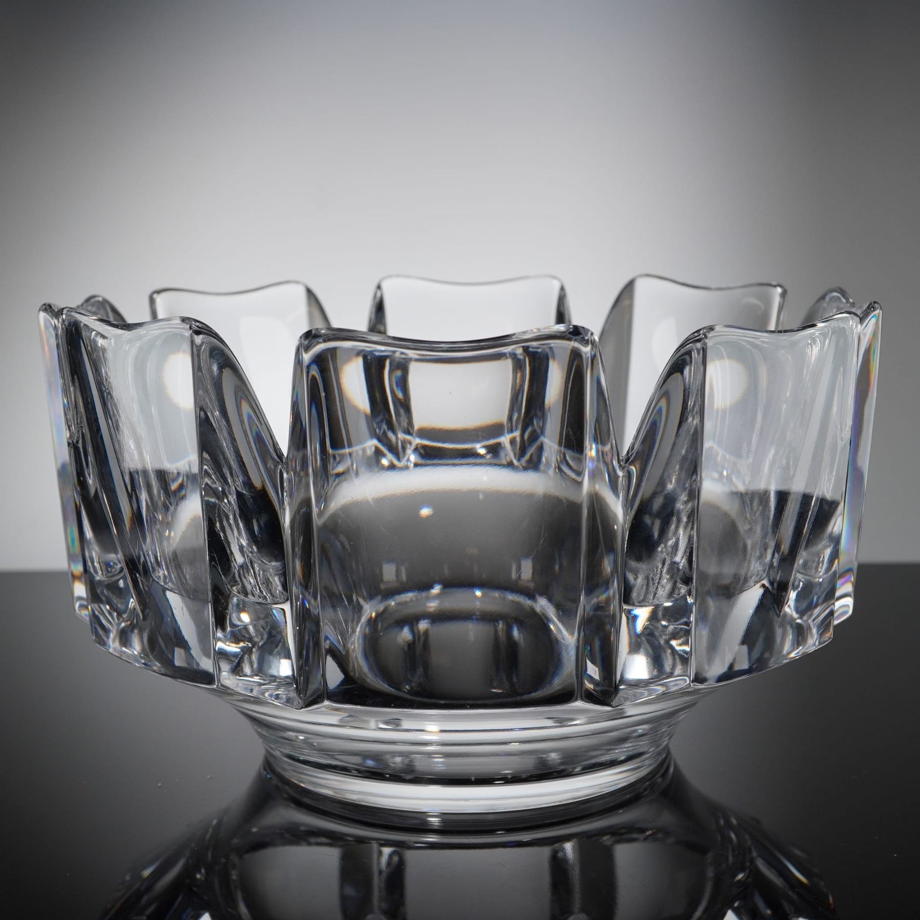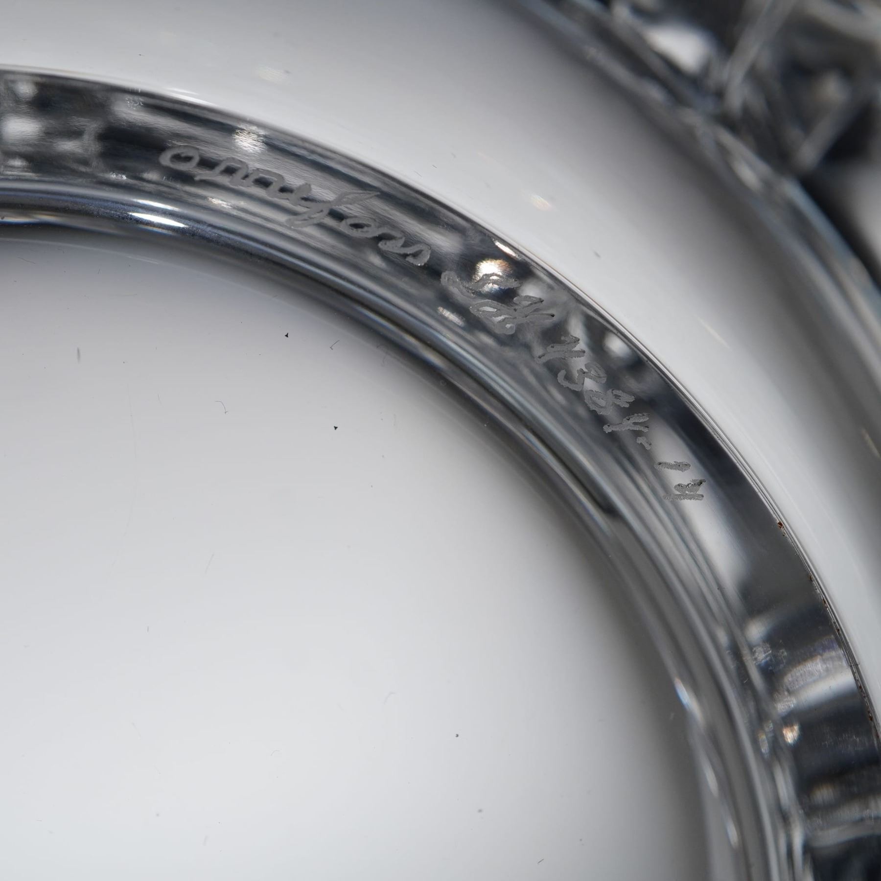 The bowl exhibits a curved surface consistent with the rim of a bowl, dish, or sculpture base. The material is heavy and clear. An etched Orrefors signature is visible along the curved surface, followed by numerals and characters.
