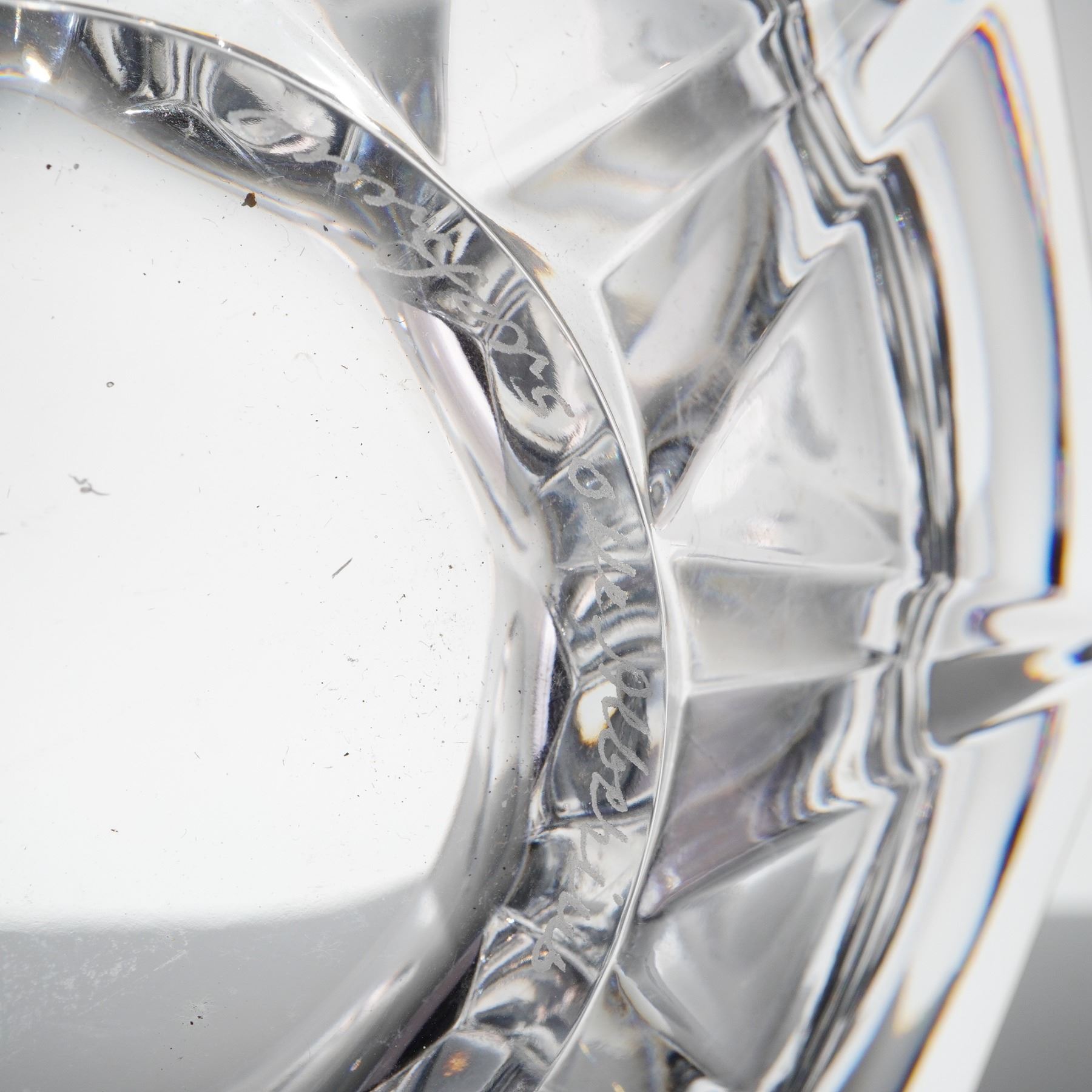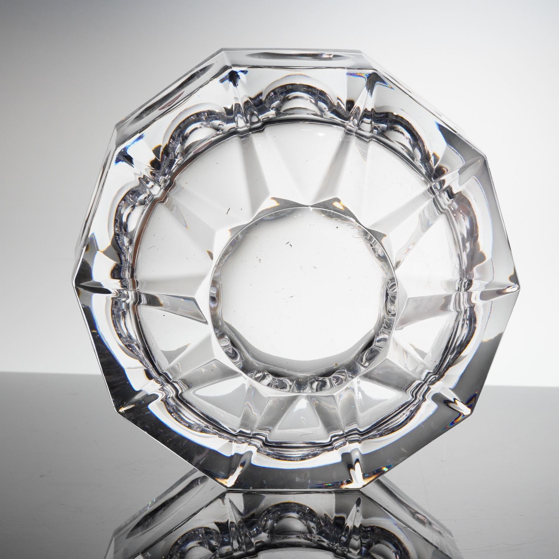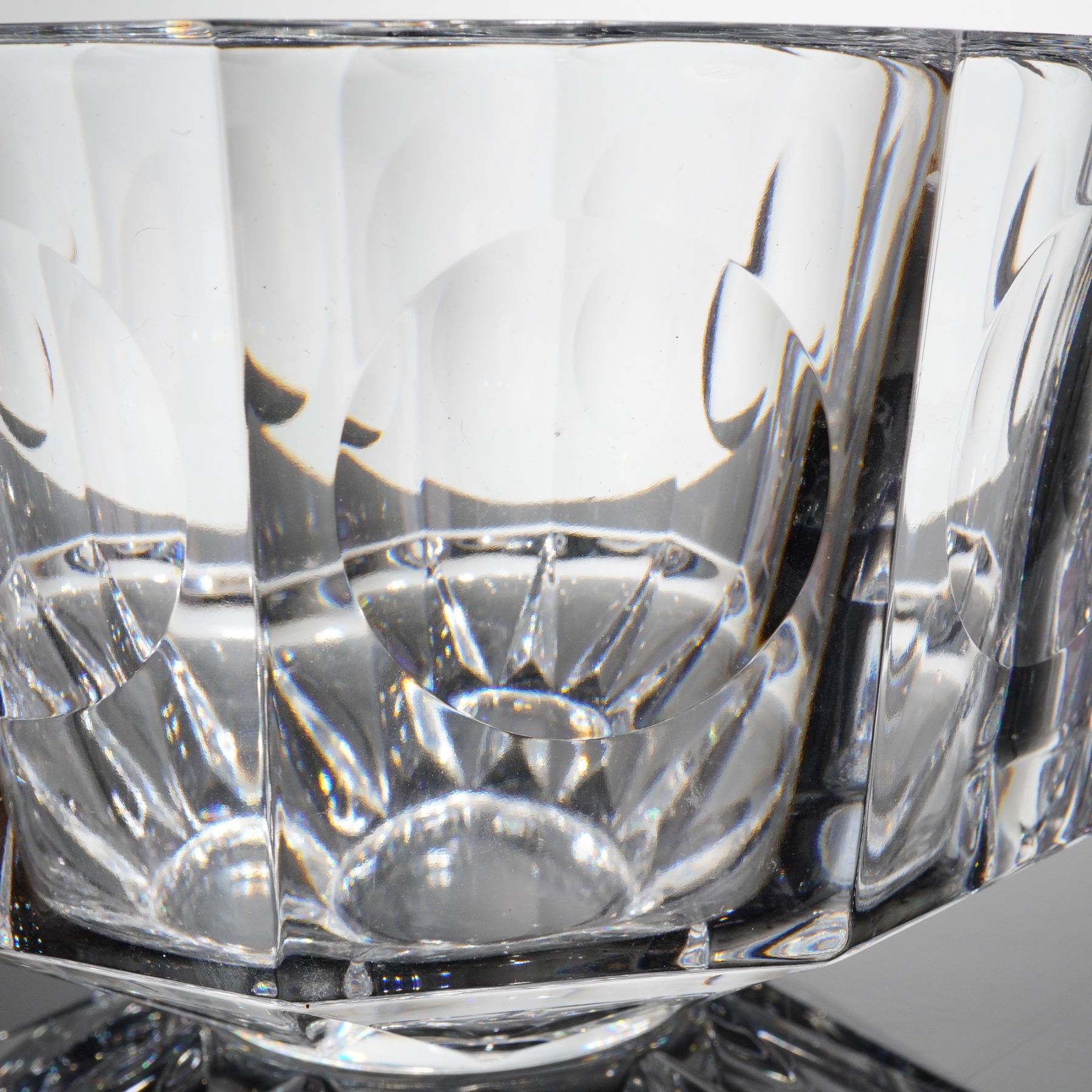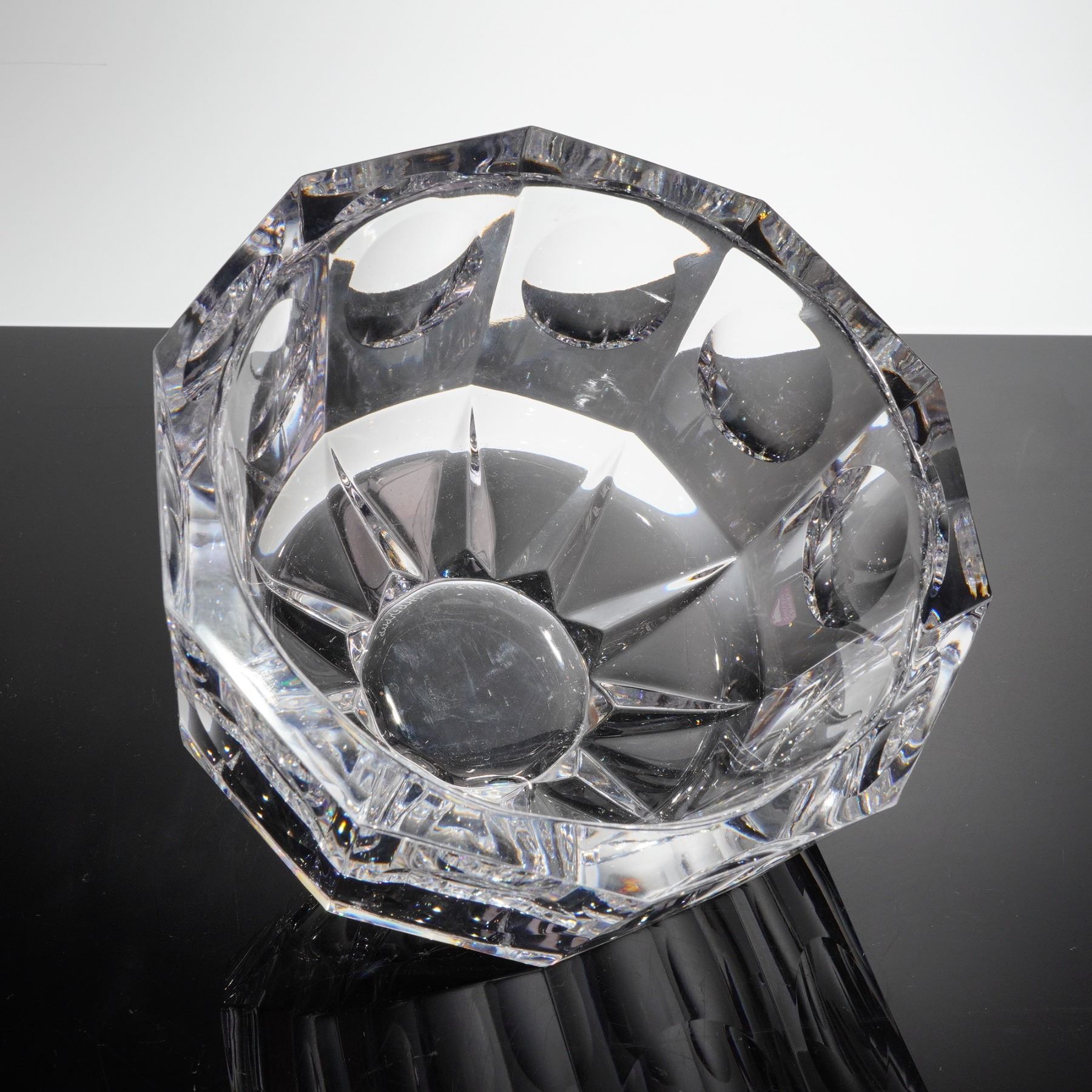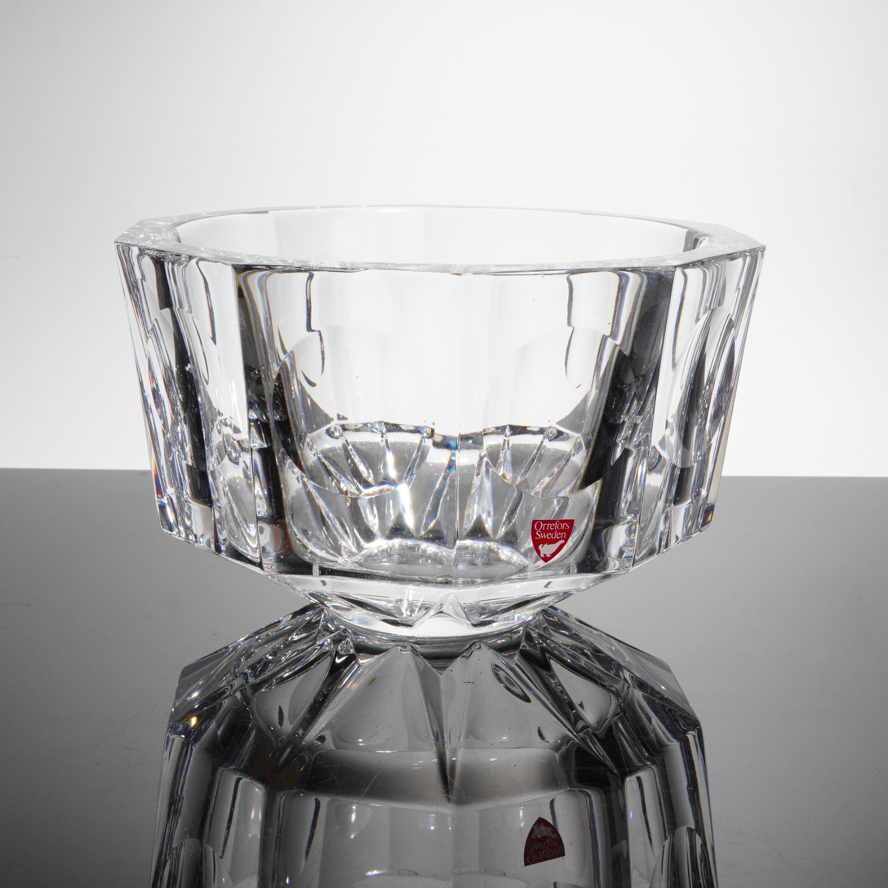 A heavy, geometrically cut clear crystal bowl designed by Olle Alberius for Orrefors, Sweden, part of the Residence line, sometimes referred to as the Swirl Bowl. The vessel is constructed of thick lead crystal and features deep, angular exterior facets. The interior decoration consists of large, circular lens cuts, often called thumbprints, surrounding the body, with smaller geometric facets surrounding the base. The bowl is signed Orrefors Olle Alberius on the base, confirmed by etched script markings on the underside rim. The item retains its original red and white foil label reading "ORREFORS SWEDEN."