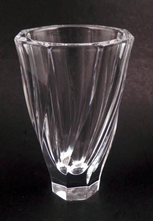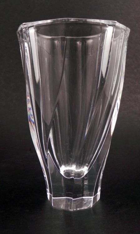 This Orrefors vase has a slightly twisting, eight sided design, with rounded opening, creating an elegant design. The underside is hand signed "Orrefors." Its condition is very good, with a couple light scuffs. It measures 8 inches high, and 5 inches in diameter. * This is a very attractive Swedish made vase, with a modern design.