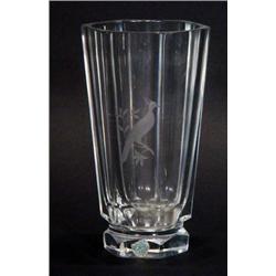 Orrefors clear cut glass vase engraved with a bird, marks to base, 16cm high
