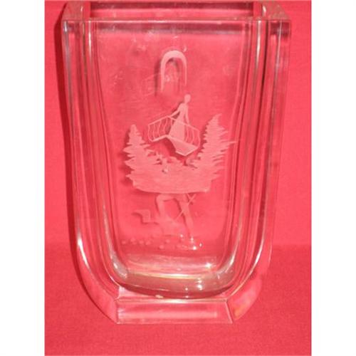 This is a very nice bucket form clear glass vase with etching on both sides in back and front and in very good condition(just small chip inside on the bottom).It is signed Orrefors N.31/01/111