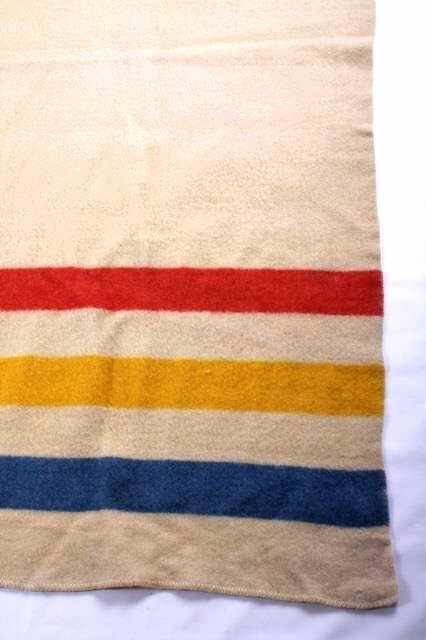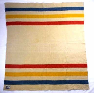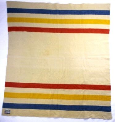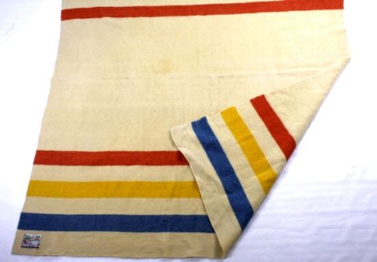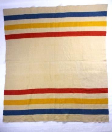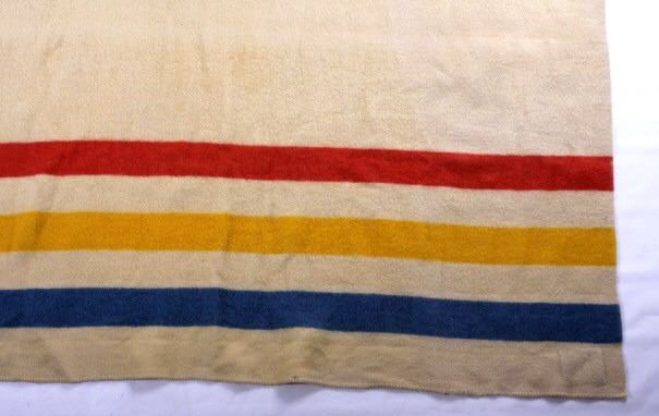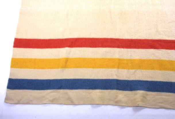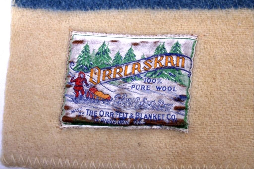 Offered in this lot we have a Orrlaskan wool trade blanket. This large blanket shows a manufacturers tag reading "Orrlaskan - 100% Pure Wool - made by The Orrfelt & Blanket Co. - in Pique, Oh. U.S.A.". The blanket shows a point style pattern on the blanket with blue, red, and yellow stripes across the top and bottom of the piece. The blanket is in good condition overall with no signs of wear. The piece measures 75" long by 59" wide.