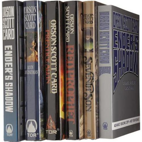 <B>Orson Scott Card Six Signed First Editions.</B></I> Includes the following:<BR><B><I>Seventh Son.</B></I></B></I> (New York: Tor, 1987), first edition, 241 pages, beige boards, 8vo, dust jacket. Condition (book/ dj): fine/ fine.<BR><B><I>Red Prophet.</B></I></B></I> (New York: Tor, 1988), first edition, 311 pages, olive green boards, 8vo, dust jacket. Condition (book/ dj): near fine/ near fine.<BR><B><I>Prentice Alvin.</B></I></B></I> (New York: Tor, 1989), first edition, 342 pages, orange boards, 8vo, dust jacket. Condition (book/ dj): binding flaw else good/ fine.<BR><B><I>Alvin Journeyman.</B></I></B></I> (New York: Tor, 1995), first edition, 381 pages, black boards, 8vo, dust jacket. Condition (book/ dj): near fine/ fine.<BR><B><I>Ender's Shadow.</B></I></B></I> (New York: Tor, 1999), first edition, 379 pages, blue boards, 8vo, dust jacket. Condition (book/ dj): fine/ fine.<BR><B><I>Ender's Shadow.</B></I></B></I> (New York: Tor, 1999), advanced reading copy, 3379 pages, stiff wraps, 8vo. Condition: near fine.<BR><BR><BR><b>Shipping:</b> Books & Catalogs (<a target="_blank" href="http://www.heritageauctions.com/common/shipping.php">view shipping information</a>)