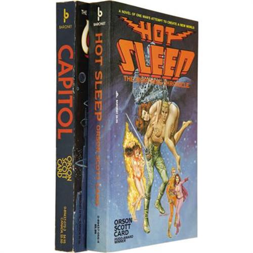 <B>Orson Scott Card: Two Signed First Editions.<BR></B></I> Includes the following:<BR><B><I>Capitol.</B></I></B></I> (New York: Baronet Publishing Company, 1979), first Baronet edition, 278 pages, wraps, 8vo. Condition: fine.<BR><B><I>Hot Sleep.</B></I></B></I> (New York: Baronet Publishing Company, 1979), first Baronet edition, 309 pages, wraps, 8vo. Condition: fine.<BR><BR><b>Shipping:</b> Books & Catalogs (<a target="_blank" href="http://www.heritageauctions.com/common/shipping.php">view shipping information</a>)