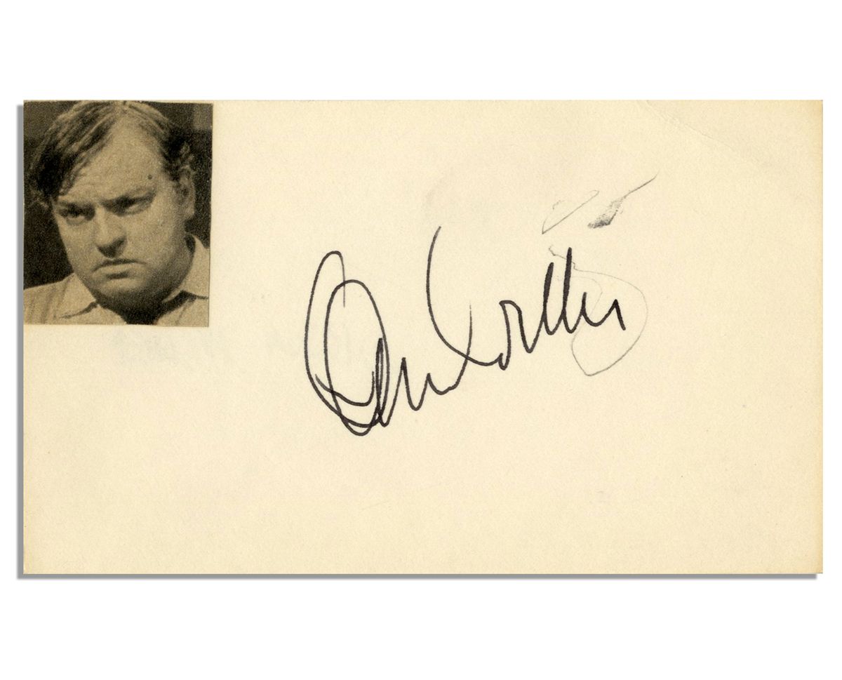 Orson Welles signed card. Signature appears ''Orson Welles'' in black ink on a 5'' x 3'' paper card with Welles' photo affixed. Pencil scratch, else near fine.