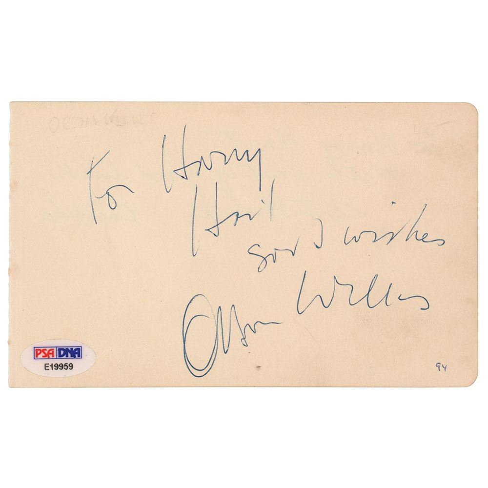 Vintage ballpoint signature and inscription, "For Harry Hart, Good wishes, Orson Welles," on an off-white 6 x 3.75 album page. In fine condition, with a PSA/DNA label affixed to the lower left corner. Accompanied by a certificate of authenticity from PSA/DNA.