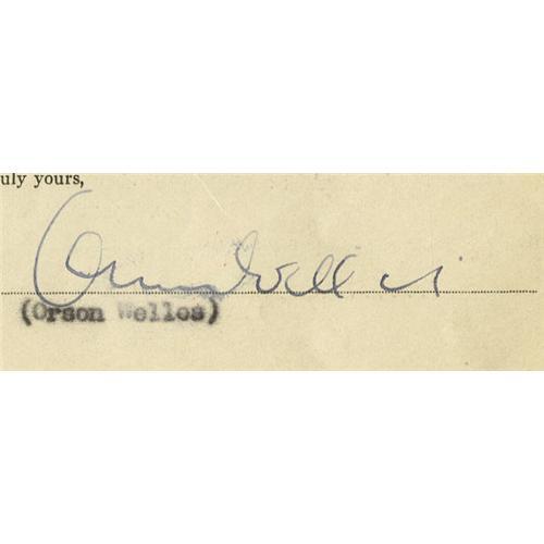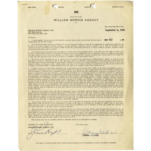 <B>Orson Welles Signed Contract.</B></I> A single-page, double-sided William Morris Agency representation contract dated September 4, 1946, signed by the legendary writer-actor-director in black ink. In Fine to Very Fine condition mild to moderate overall tanning, staple and binder holes to the top edge, and a faint rusty paperclip indentation.<BR><BR><b>Shipping:</b> Flat Material, Small (<a target="_blank" href="http://www.heritageauctions.com/common/shipping.php">view shipping information</a>) <BR><BR><B>Important notice:<