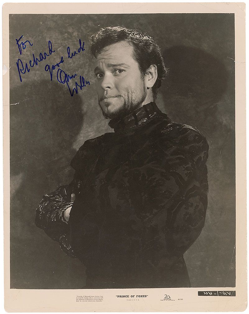 Glossy 8 x 10 20th Century Fox promotional photo for Prince of Foxes, signed and inscribed in blue felt tip “For Richard, Good luck, Orson Welles.” Scattered noticeable creases and surface marks, a small repaired tear to reverse, and some scattered light surface loss, otherwise very good condition.