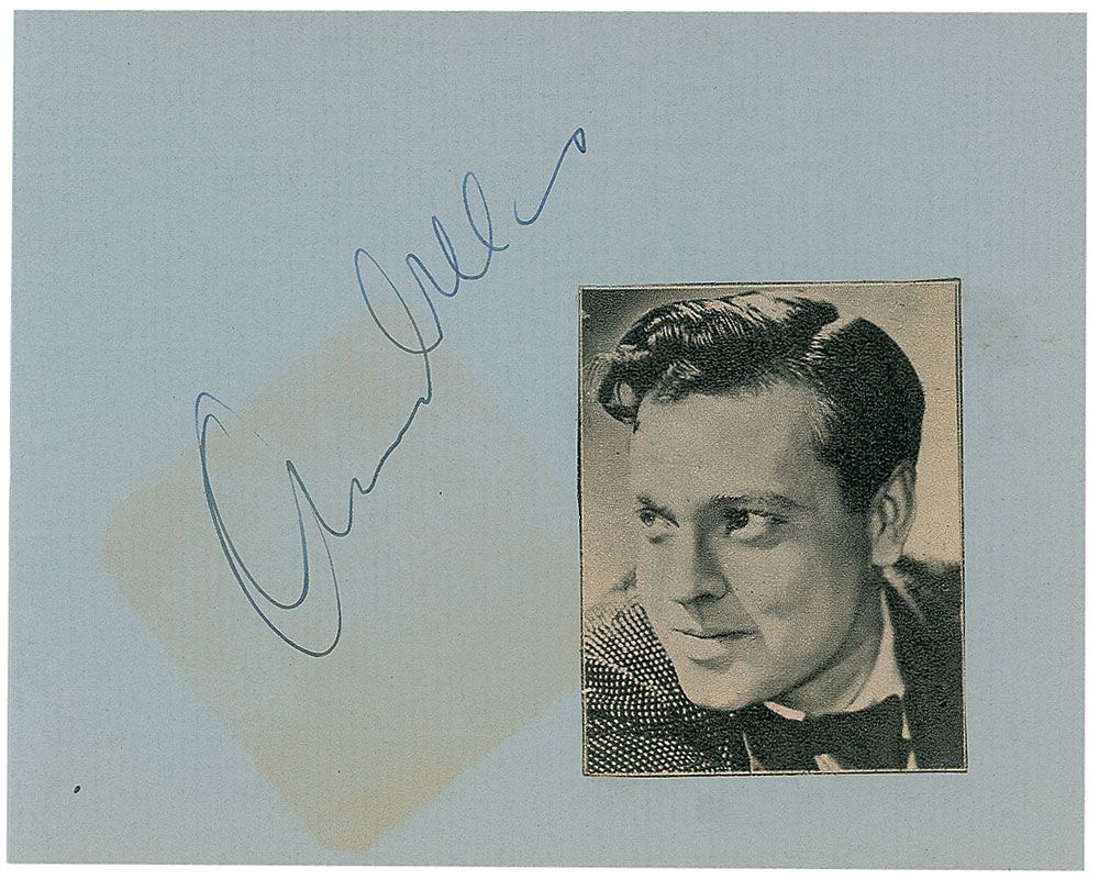 Vintage fountain pen signature, “Orson Welles,” on a light blue 5.25 x 4 album page. In very good condition, with a block of toning affecting a portion of the signature and some light scattered rippling. Also signed and inscribed on the reverse by Martha Vickers.