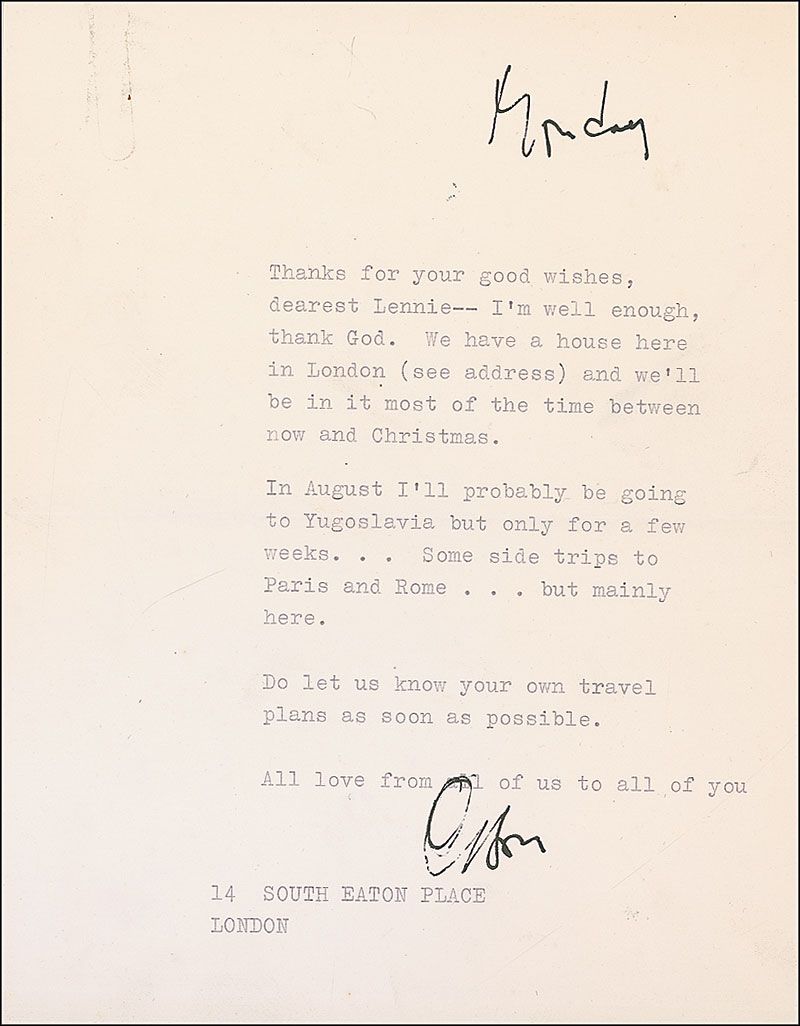 TLS signed “Orson,” one page, 6.25 x 8, no date. Letter to Lennie [Leonard Lyons]. In part: “I’m well enough, thank God. We have a house here in London……and we’ll be in it most of the time between now and Christmas. In August I’ll probably be going to Yugoslavia but only for a few weeks.” Some light skipping to signature, some mild toning and wrinkling, and a paperclip impression to top edge, otherwise fine condition.