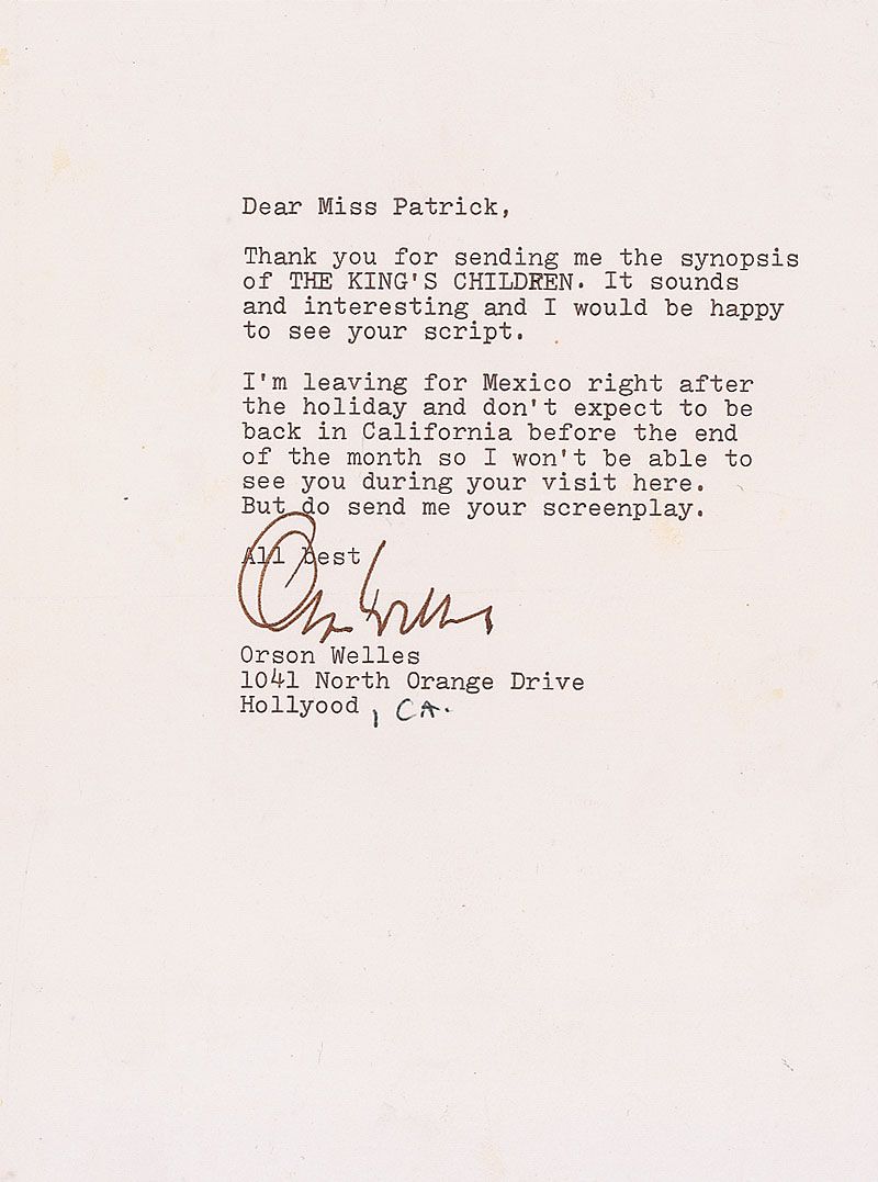 TLS, one page, 5.75 x 7.75, no date. Letter to an aspiring screenwriter. In part: “Thank you for sending me the synopsis of The King’s Children. It sounds and [sic] interesting and I would be happy to see your script.” In fine condition, with the central horizontal mailing fold passing through the signature.
