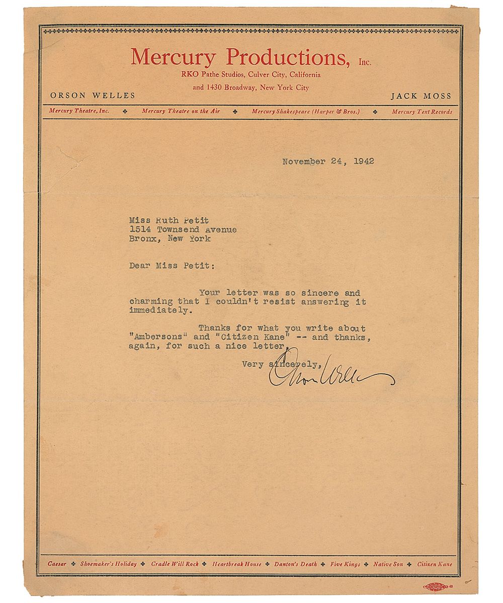 TLS, one page, 8.5 x 11, Mercury Productions letterhead, November 24, 1942. Letter to an admirer. In full: “Your letter was so sincere and charming that I couldn’t resist answering it immediately. Thanks for what you write about ‘Ambersons’ and ‘Citizen Kane’—and thanks, again, for such a nice letter.” Affixed at the corners to a brittle scrapbook page. A noticeable tear to the upper left and some show-through at corners from mounting remnants to reverse, otherwise fine condition.