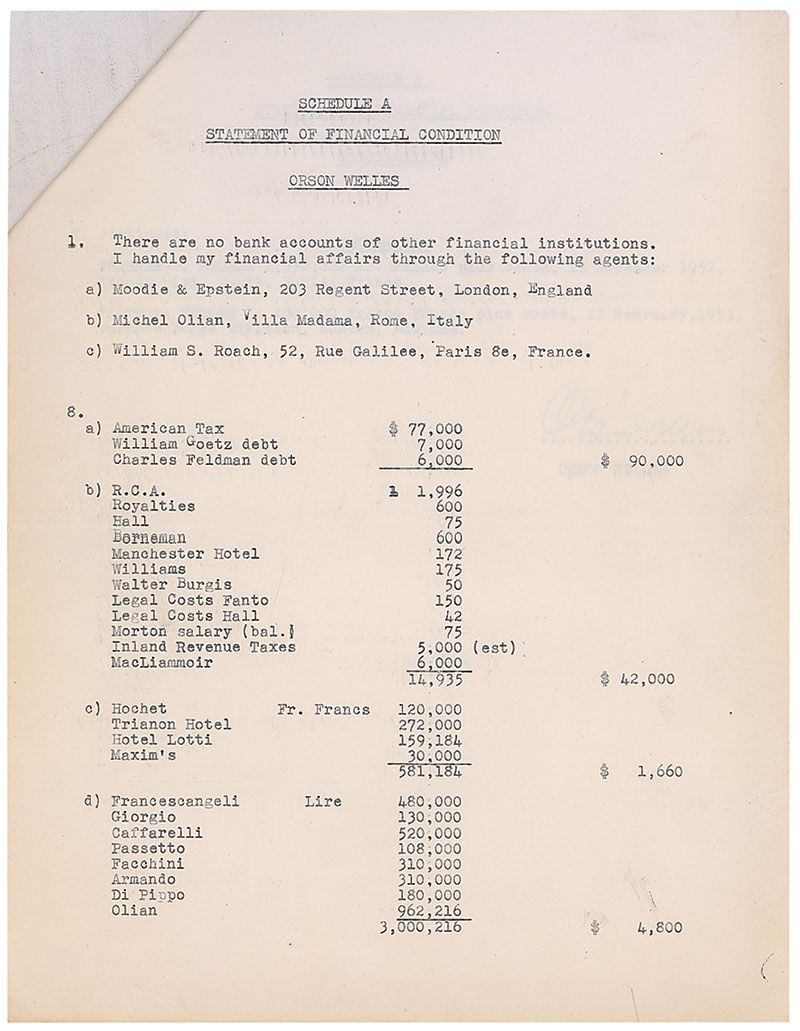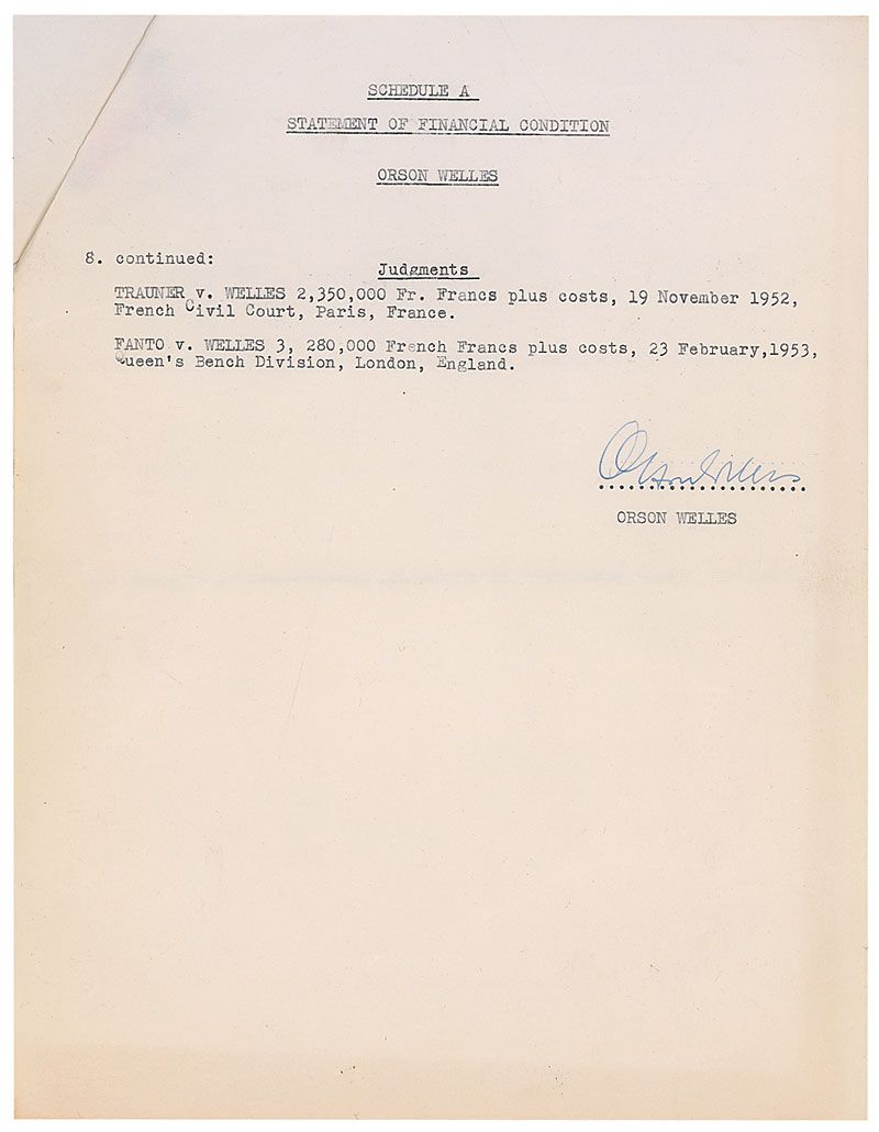 Desirable twice-signed DS, four pages, 8 x 10.75, May 1, 1953. Statement of financial condition of Welles, which lists his employment as “Independent film producer, actor, author, director,” listing his costs at $50,800, and his accounts payable as $138,460, and listing his assets on the following page. The final line asks for a statement regarding an increase in his income, to which Welles’s typed response reads: “As a motion picture producer I am seeking financial backing for future production but thus far I have not succeeded. There is always the possibility that I will make satisfactory arrangements but it is impossible to make accurate predictions in this respect.” Final two pages are Welles’s finances, as well as two court judgements involving Welles. Signed on the second and fourth page by Welles. In fine condition, with expected document wear. Document retains half of its red wax seal and its original ribbon.