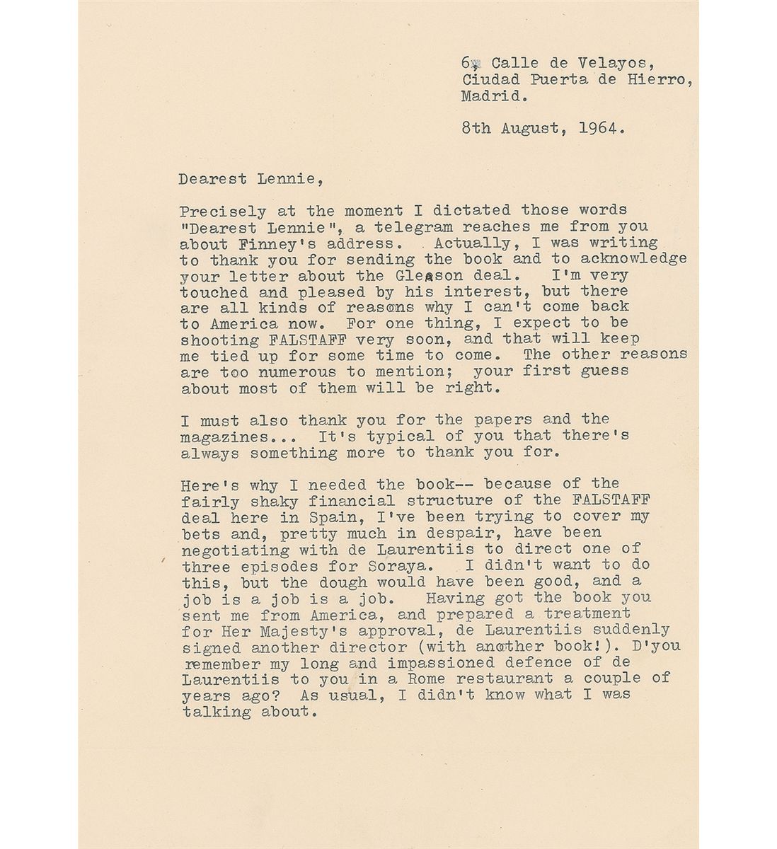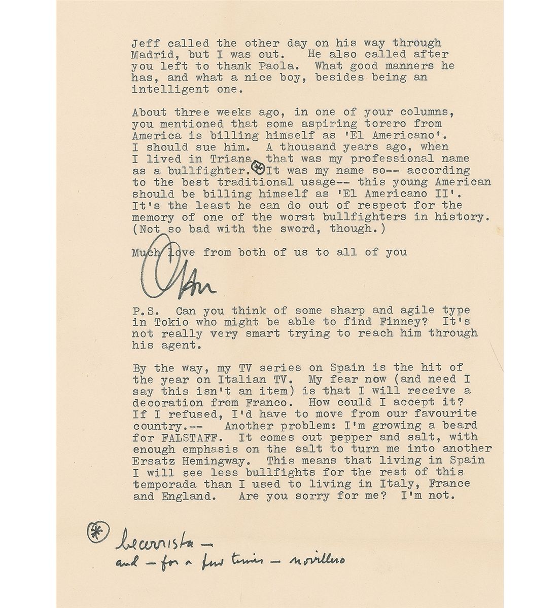 TLS signed “Orson,” two pages, 6.5 x 9, August 8, 1964. Letter to columnist Leonard Lyons. In part: “I was writing to thank you for sending the book and to acknowledge your letter about the Gleason deal…I expect to keep shooting Falstaff very soon…Here’s why I need the book—because of the fairly shaky financial structure of the Falstaff deal here in Spain, I’ve been trying to cover my bets and, pretty much in despair, have been negotiating with de Laurentiis to direct one of three episodes for Soraya. I didn’t want to do this, but the dough would have been good, and a job is a job is a job. Having got the book you sent me from America, and prepared a treatment for Her Majesty’s approval, de Laurentiis suddenly signed another director (with another book!). D’you remember my long and impassioned defense of de Laurentiis to you in a Rome restaurant a couple of years ago? As usual, I didn’t know what I was talking about…About three weeks ago, in one of your columns, you mentioned that some aspiring torero from America is billing himself as ‘El Americano.’ I should sue him…that was my professional name as a bullfighter.” Under his signature, Welles adds a lengthy postscript which reads, in part: “My TV series on Spain is the hit of the year on Italian TV. My fear now…is that I will receive a decoration from Franco. How could I accept it? If I refused, I’d have to move from our favorite country—Another problem: I’m growing a beard for Falstaff. It comes out pepper and salt, with the emphasis on the salt to turn me into another Ersatz Hemingway.” In fine condition. Accompanied by the original mailing envelope. Welles had a long-standing mutual appreciation for Jackie Gleason, and they would often meet when he passed through New York to discuss collaborating on projects. It was Welles who first nicknamed Gleason ‘The Great One.’ A year prior to this letter, Dino de Laurentiis convinced Welles to direct an episode of his epic The Bible: In the Beginning, with Welles accepting mainly for the $200,000 paycheck. His version far differed from de Laurentiis’s idea, and he was replaced by John Huston. Welles’s television program, In the Land of Don Quixote, was a travelogue of Spain done for Italian television. The director’s insistence to narrate the show himself in Italian was rebuffed by the network, and the release was delayed until 1964, with the network adding its own narration.