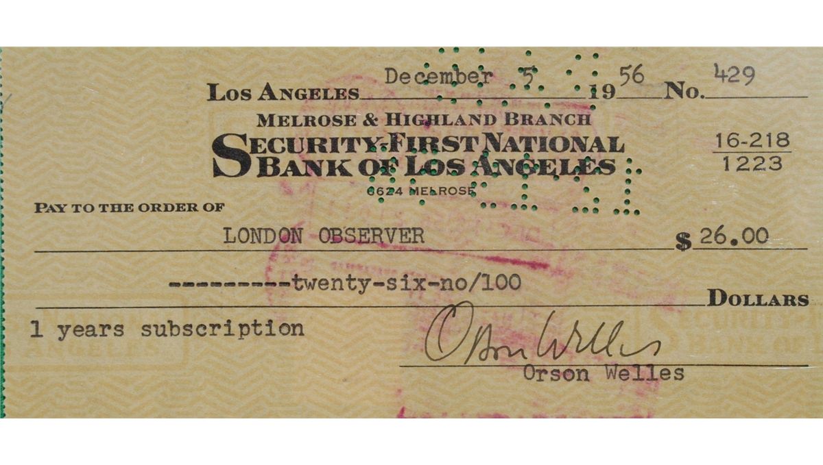 Bank check, 6 x 2.5, filled out in type and signed by Welles, payable to London Observer for $26.00, Feb 24, 1954. Typed memo line in lower left reads, “1 year subscription.”.