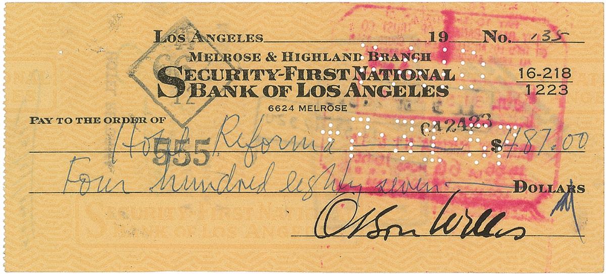 Security-First National Bank of Los Angeles check, 6. x 2.75, no date, filled out in another hand and signed by Welles, payable to Hotel Reforma for $487. In very good condition, with a central vertical fold, staple holes to upper left corner, and expected bank notations, cancellation holes, and stamps (affecting the top of the surname).
