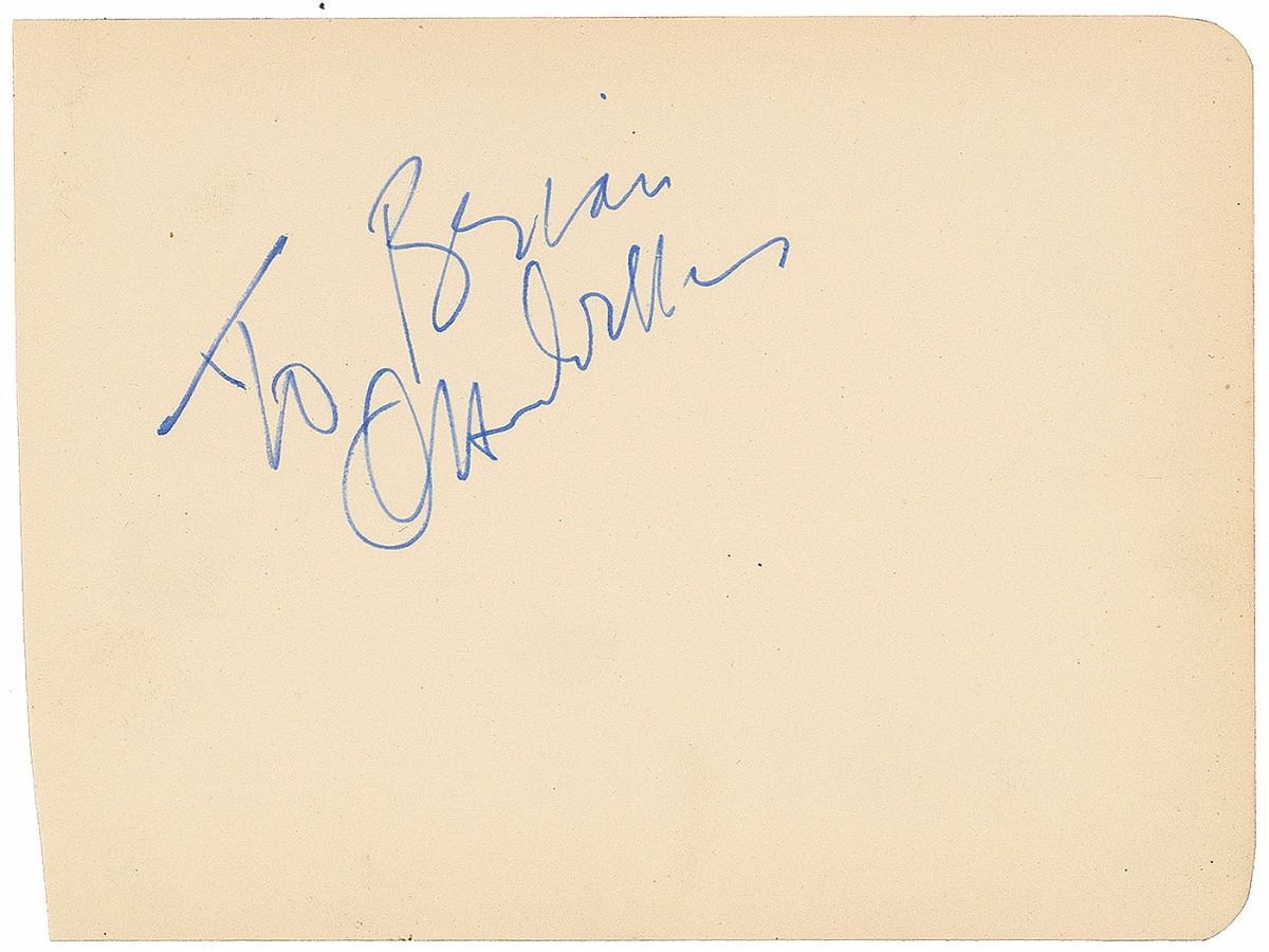 Vintage fountain pen signature and inscription, “To Brian, Orson Welles,” on an off-white 5.5 x 4 album page. In fine condition.
