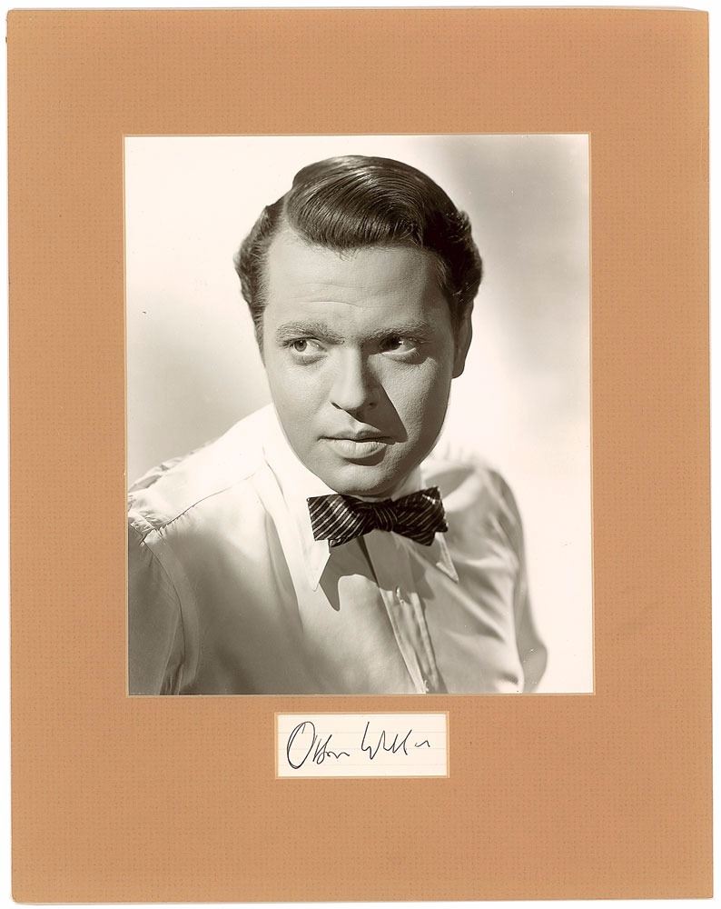 Ink signature, "Orson Welles," on an off-white 2.5 x 1 lightly-lined slip. Matted with a glossy photo of Welles wearing a bow tie to an overall size of 11 x 14. In fine condition.