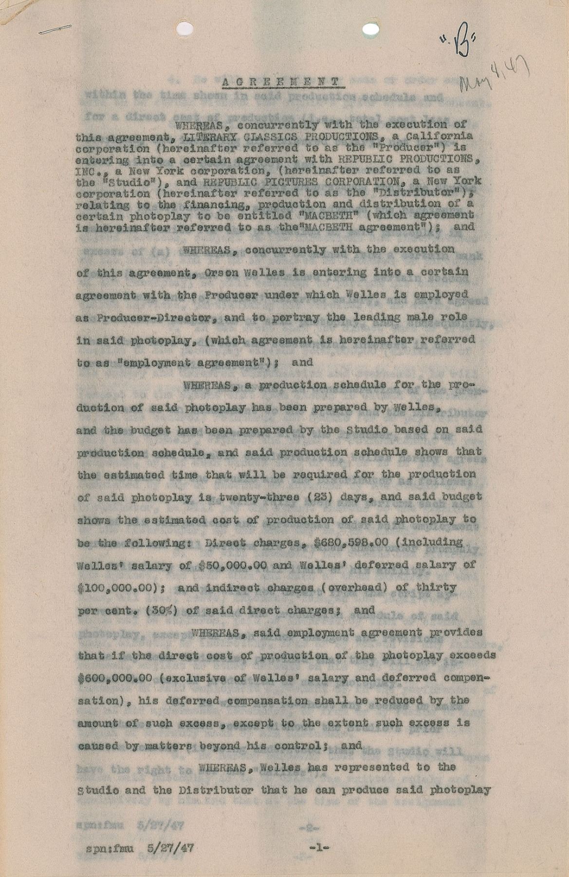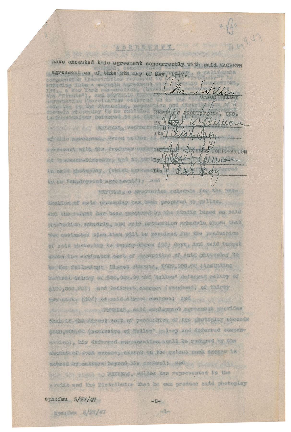 DS, five pages, 8.5 x 13, May 8, 1947. Contract between Republic Pictures and Orson Welles, who agrees to be "employed as Producer–Director, and to portray the leading male role" in the 1948 historical war drama Macbeth, with a planned production of 23 days. Signed at the conclusion in black ink by Welles, and countersigned by a studio representative. In fine condition. Welles on the film: 'My purpose in making Macbeth was not to make a great film—and this is unusual, because I think that every film director, even when he is making nonsense, should have as his purpose the making of a great film. I thought I was making what might be a good film, and what, if the 23-day day shoot schedule came off, might encourage other filmmakers to tackle difficult subjects at greater speed. Unfortunately, not one critic in any part of the world chose to compliment me on the speed. They thought it was a scandal that it should only take 23 days. Of course, they were right, but I could not write to every one of them and explain that no one would give me any money for a further day's shooting.'