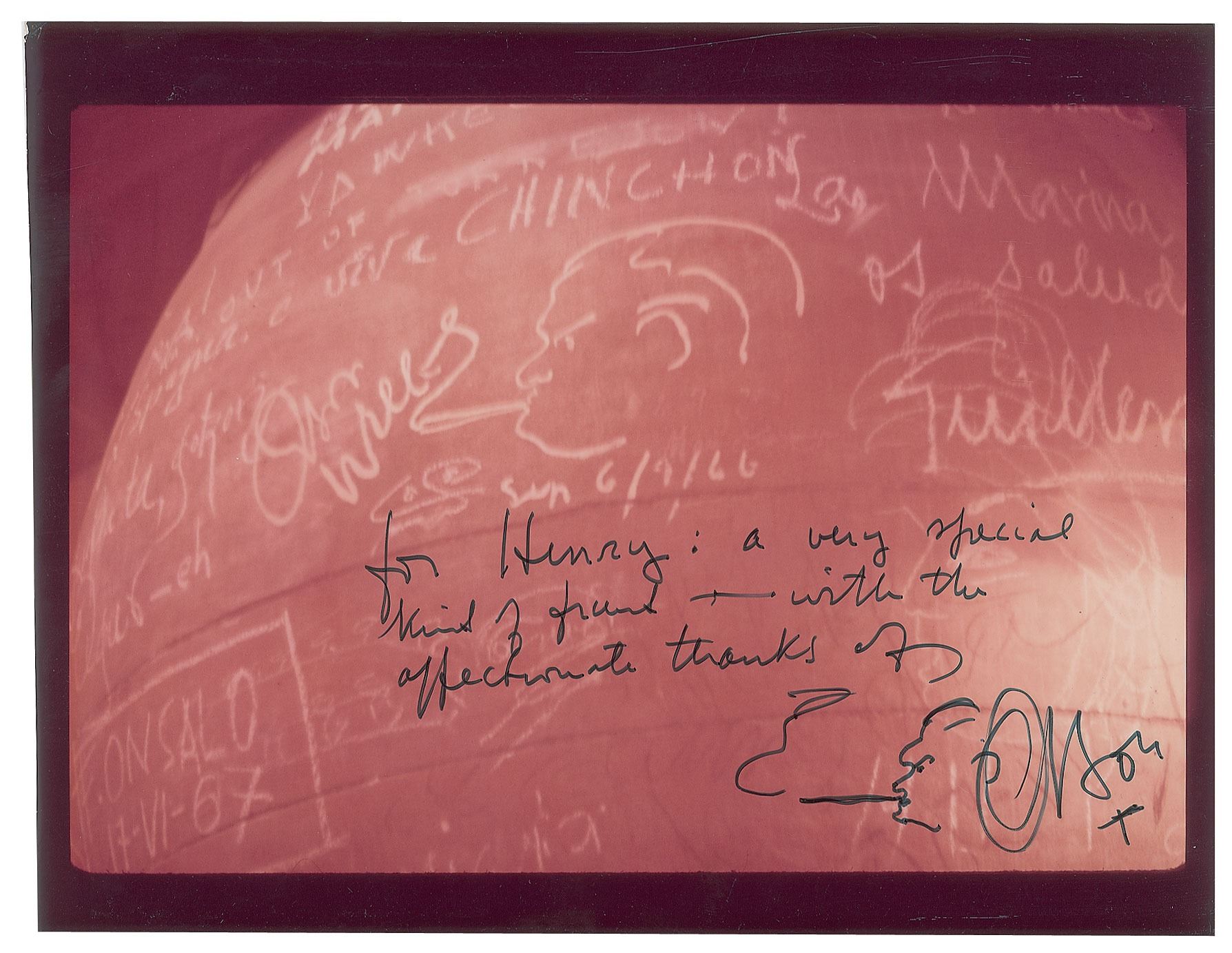 Color glossy 10.25 x 8 photo of a chalkboard featuring a self-portrait sketch by Orson Welles, signed and inscribed in black felt tip, "For Henry: a very special kind of friend—with the affectionate thanks of Orson," who adds the same smoking self-portrait sketch. In fine condition.