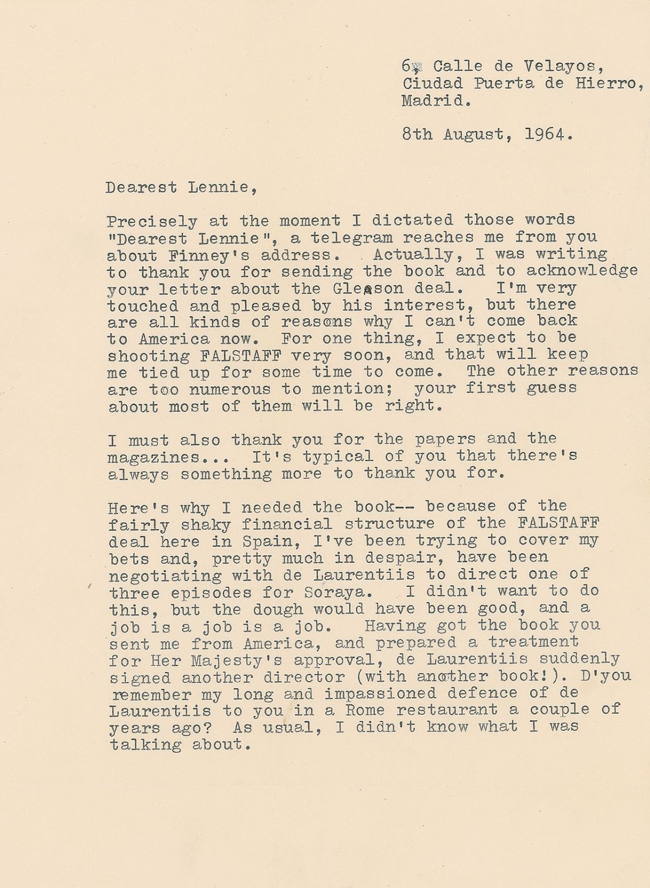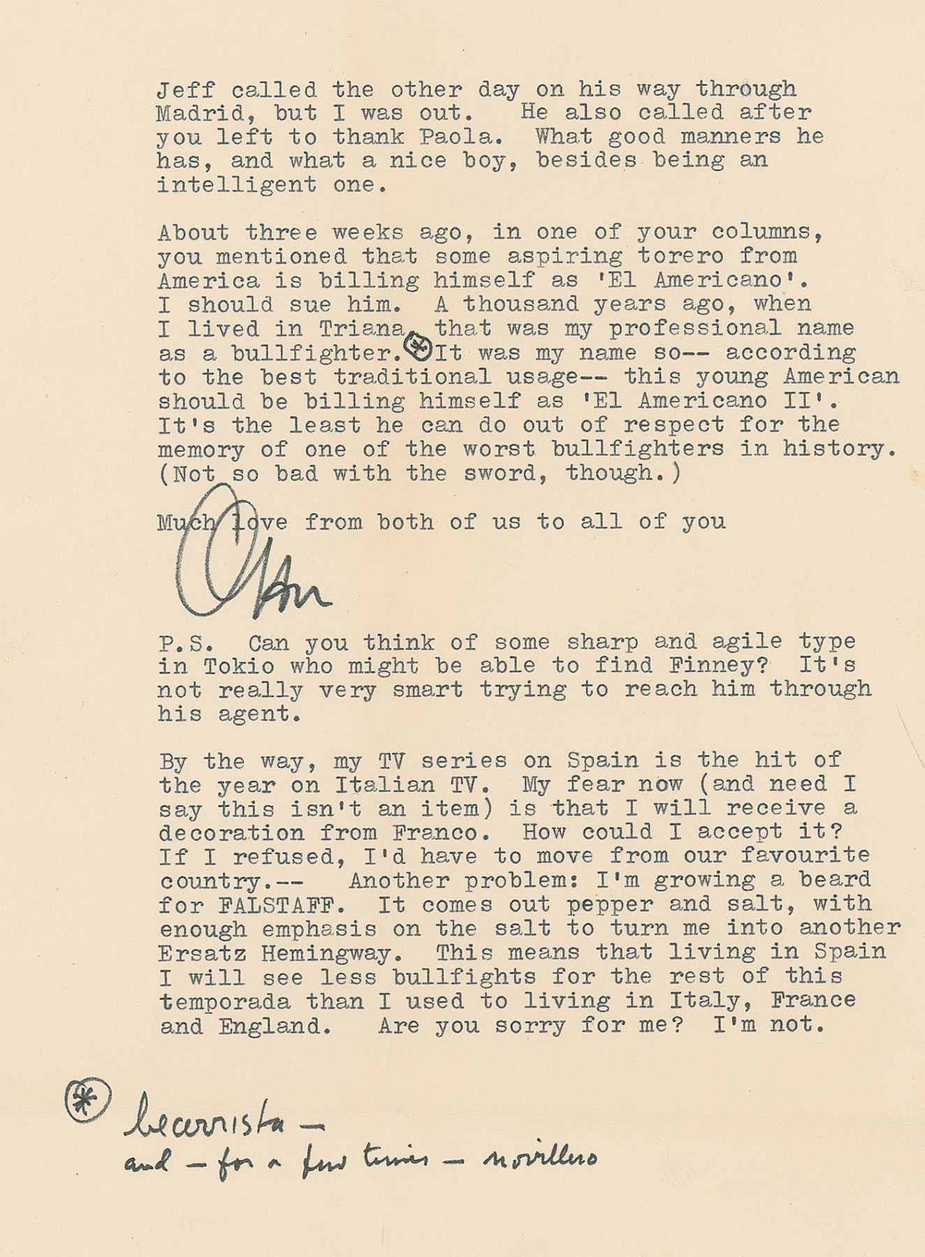 Important and humorous TLS signed "Orson," two pages, 6.5 x 9, August 8, 1964. Letter to columnist Leonard Lyons, an important theatre/dance critic. In part: "I was writing to thank you for sending the book and to acknowledge your letter about the Gleason deal…I expect to keep shooting Falstaff very soon…Here's why I need the book-because of the fairly shaky financial structure of the Falstaff deal here in Spain, I've been trying to cover my bets and, pretty much in despair, have been negotiating with de Laurentiis to direct one of three episodes for Soraya. I didn't want to do this, but the dough would have been good, and a job is a job is a job. Having got the book you sent me from America, and prepared a treatment for Her Majesty's approval, de Laurentiis suddenly signed another director (with another book!). D'you remember my long and impassioned defense of de Laurentiis to you in a Rome restaurant a couple of years ago? As usual, I didn't know what I was talking about…About three weeks ago, in one of your columns, you mentioned that some aspiring torero from America is billing himself as 'El Americano.' I should sue him…that was my professional name as a bullfighter." Under his signature, Welles adds a lengthy postscript which reads, in part: "My TV series on Spain is the hit of the year on Italian TV. My fear now…is that I will receive a decoration from Franco. How could I accept it? If I refused, I'd have to move from our favorite country-Another problem: I'm growing a beard for Falstaff. It comes out pepper and salt, with the emphasis on the salt to turn me into another Ersatz Hemingway." In fine condition. Accompanied by the original mailing envelope. Welles had a long-standing mutual appreciation for Jackie Gleason, and they would often meet when he passed through New York to discuss collaborating on projects. It was Welles who first nicknamed Gleason 'The Great One.' A year prior to this letter, Dino de Laurentiis convinced Welles to direct an episode of his epic The Bible: In the Beginning, with Welles accepting mainly for the $200,000 paycheck. His version far differed from de Laurentiis's idea, and he was replaced by John Huston. Welles's television program, In the Land of Don Quixote, was a travelogue of Spain done for Italian television. The director's insistence to narrate the show himself in Italian was rebuffed by the network, and the release was delayed until 1964, with the network adding its own narration.