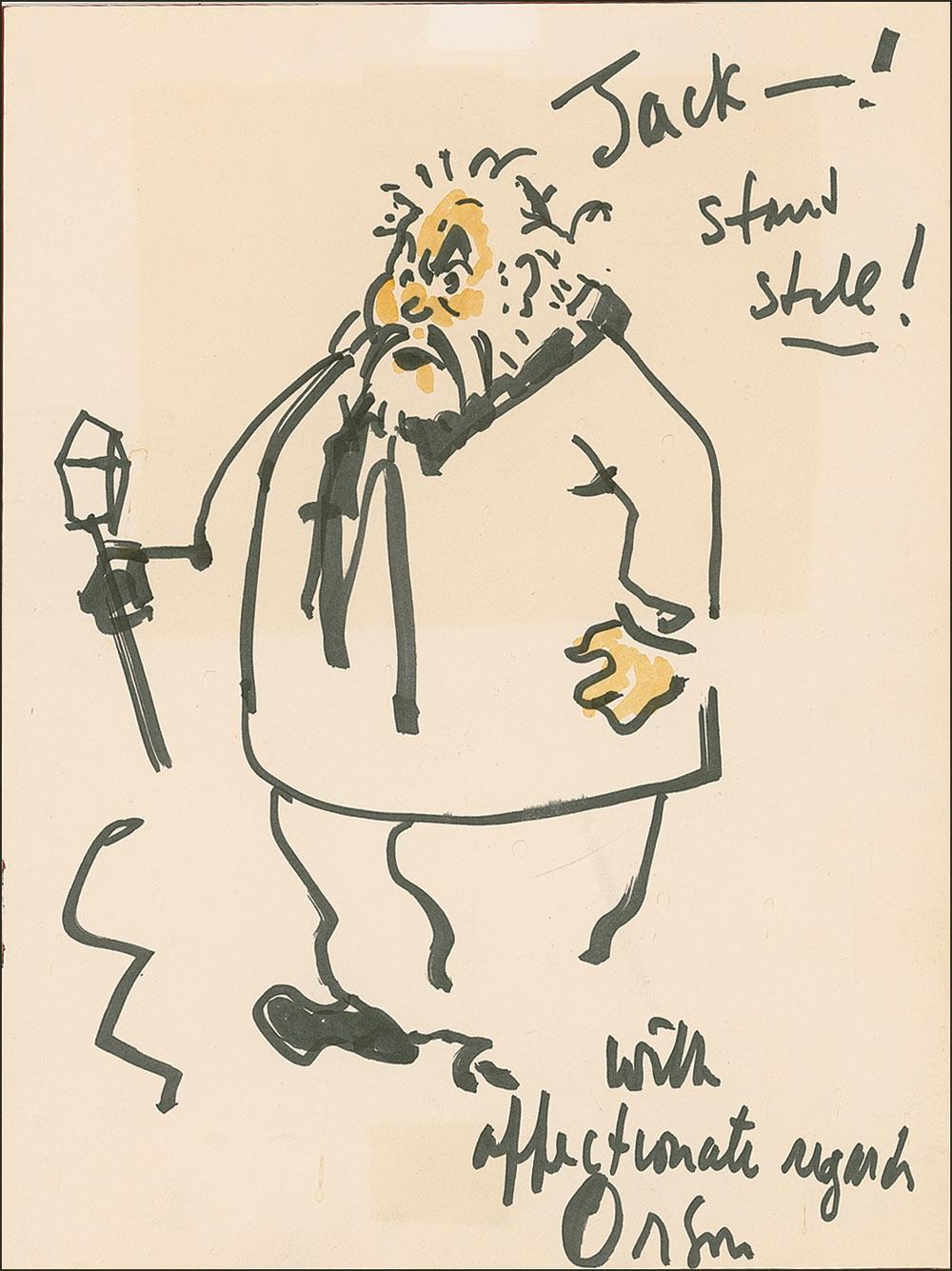 Original signed and inscribed felt tip self-portrait caricature of Welles impatiently tapping his foot, on an off-white 10 x 13 sheet, signed and inscribed “Jack—! Stand still! With affectionate regards, Orson.” Sketch is affixed to an identical size board. In fine condition, with a mild block of toning over upper portion of image, and a few other light spots of toning. A well-done and accurate portrayal by Welles.