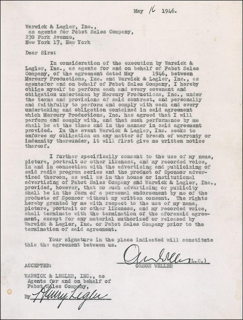 DS, one onionskin page, 8 x 10, May 16, 1946. An agreement between Welles’s company, Mercury Productions, and Pabst regarding Welles’s consent to the use “of my name, picture, portrait or other likeness, and my recorded voice,”with Welles also mentioning “that no such advertising or publicity shall be in the form of a personal endorsement.” In fine condition, with mild edge toning, a few faint creases, tiny spot in lower left corner.