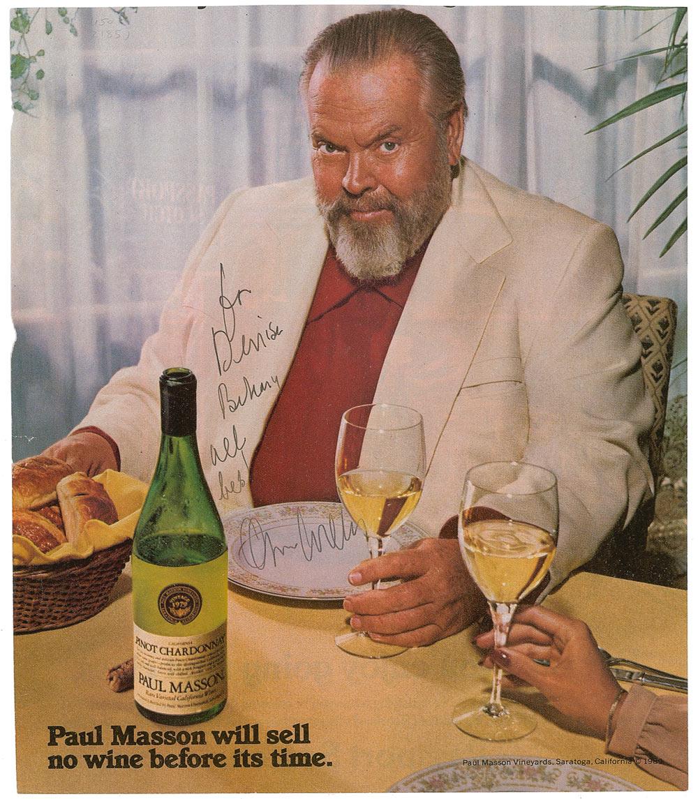 Color 8 x 9.25 magazine photo of Welles endorsing Paul Masson wine, signed and inscribed in black ink “For Denise Behary, all best, Orson Welles.” In fine condition, with trimmed edges and a small pencil notation to top edge.