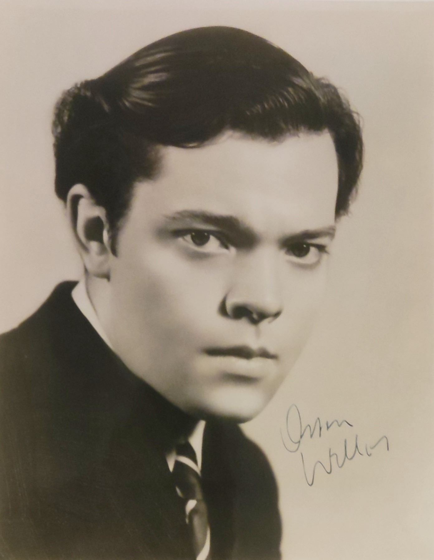 An Orson Wells signed photo in biro. 10x8 inches. Photo mounted onto board, framed. Supplied with coa.
