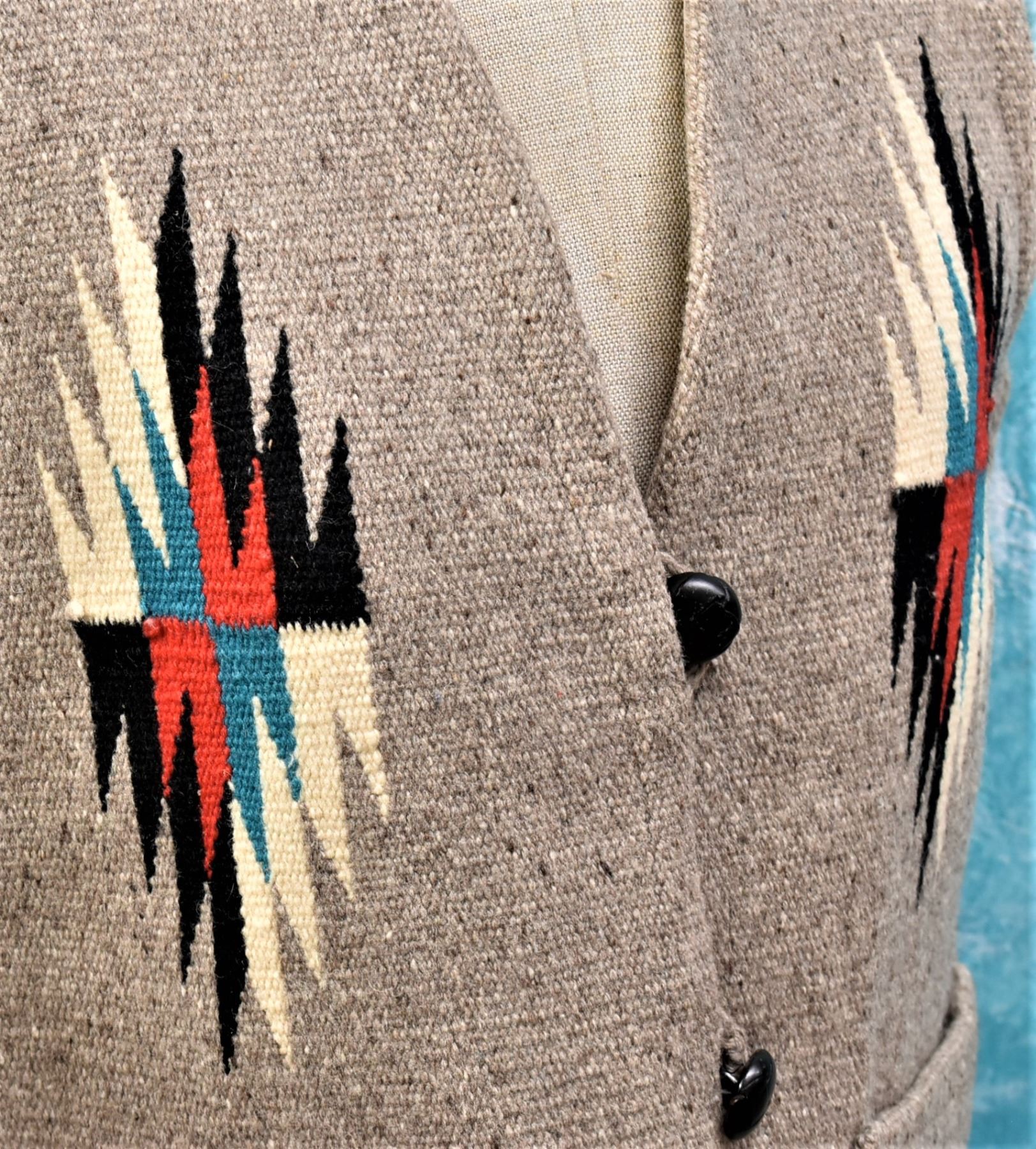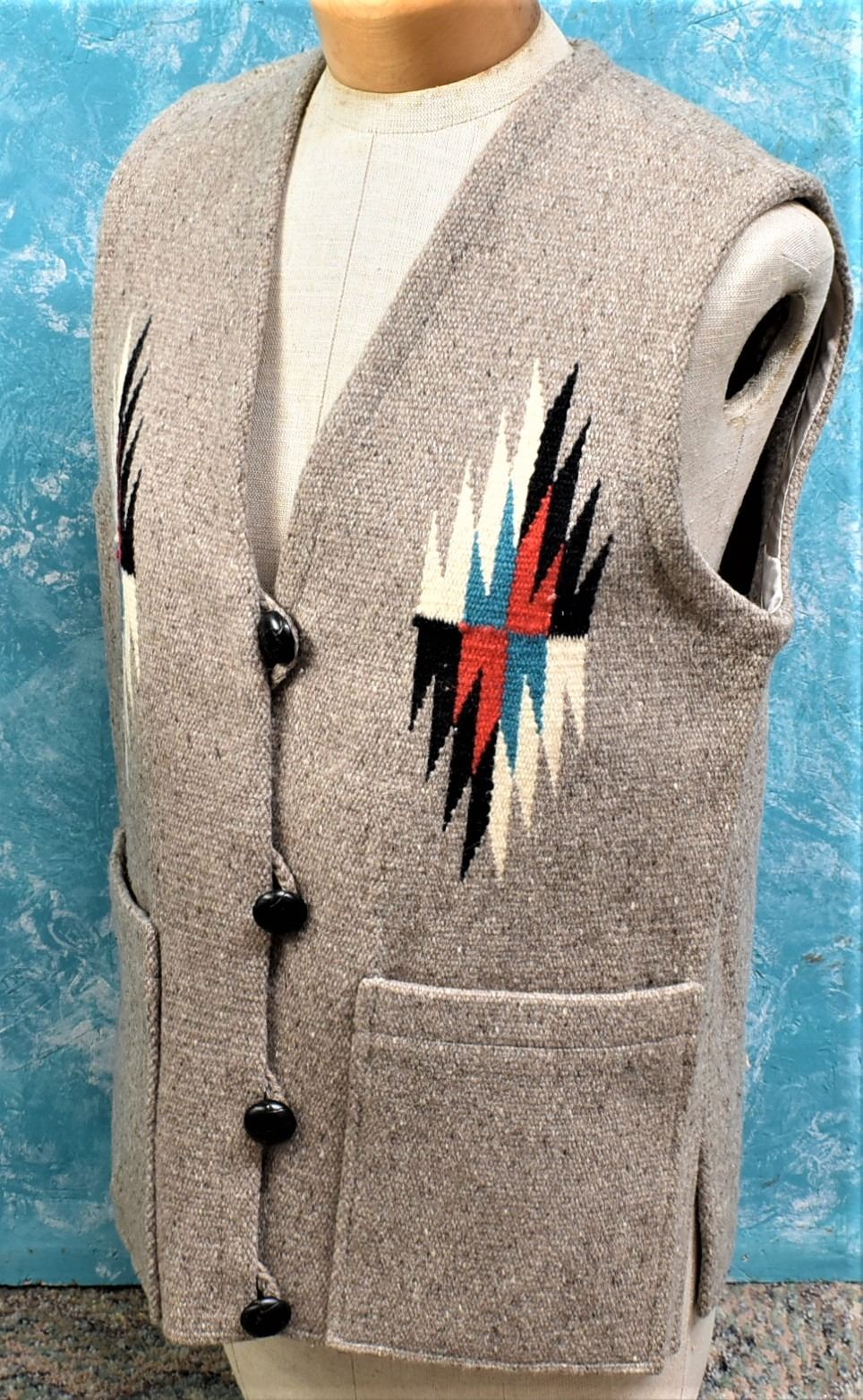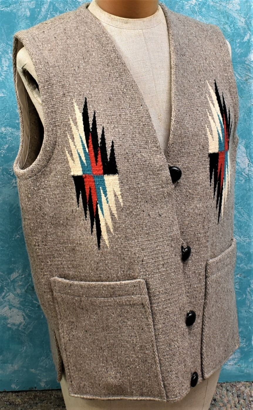 Ortega's 100% Wool Hand Woven Vest, Chimayo New Mexico, size M, beautiful serrated diamond pattern, chest 40'', length from shoulder to hem 25'', beautifully hand woven