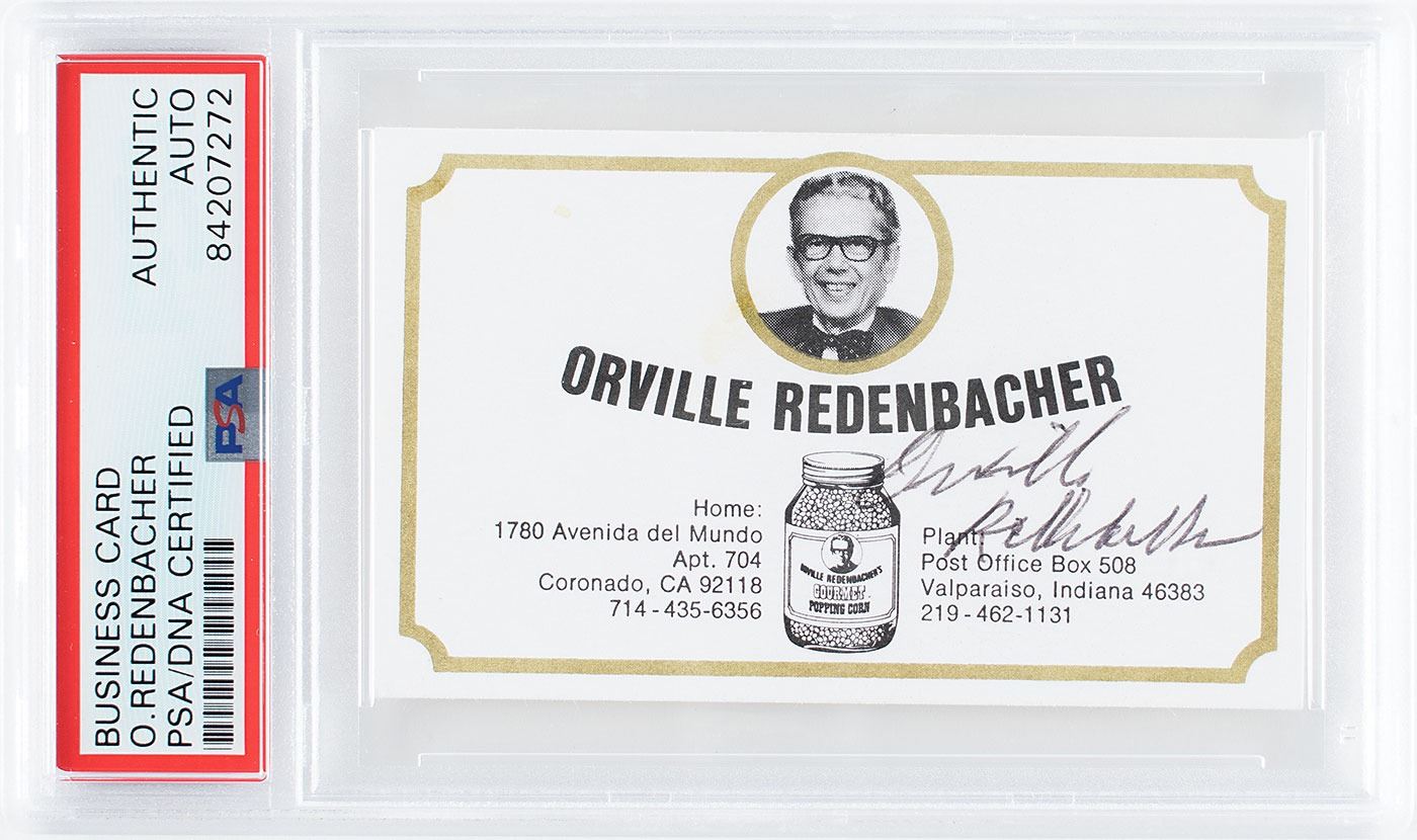 Business card belonging to Orville Redenbacher, 3.5 x 2, with portrait and image of a jar of "Orville Redenbacher's Gourmet Popping Corn," signed in black ballpoint. In fine condition. Encapsulated in a PSA/DNA authentication holder.