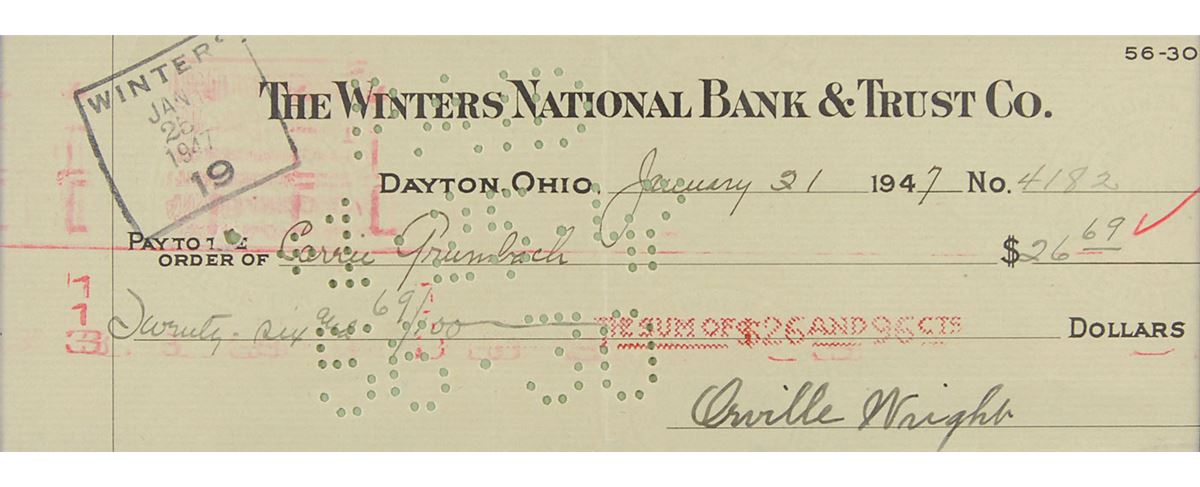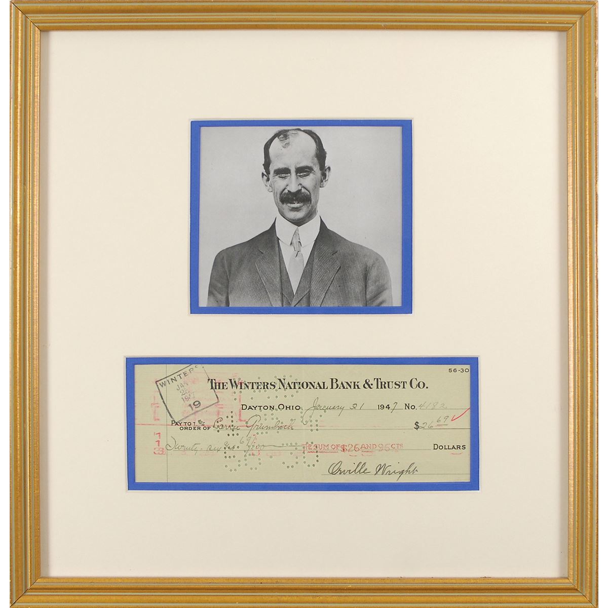 The Winters National Bank & Trust Co. bank check, 8.25 x 2.75, filled out in another hand and signed by Wright, payable to Carrie Grumbach for $26.69, January 21, 1947. Attractively double-matted and framed with a bust-length picture of the younger Wright brother to an overall size of 14.25 x 14.75. In fine condition, with a central vertical fold, and expected bank stamps and cancellation holes (none affecting the bold signature). Grumbach served as Wright’s housekeeper for nearly 50 years. Starting as a 14-year-old, she primarily cooked and cleaned before assuming full duties when Wright’s sister, Katharine, married in 1926. Orville Wright passed away on January 30, 1948, a little over a year from the day this check was signed.