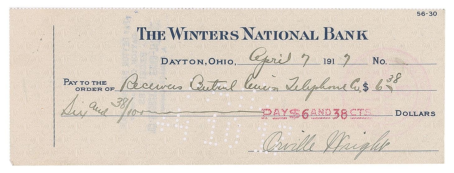 The Winters National Bank check, 8.25 x 3, filled out in another hand and signed by Orville Wright, payable to Receivers Central Union Telephone Co. for $6.38, April 7, 1917. In fine condition, with one vertical fold.