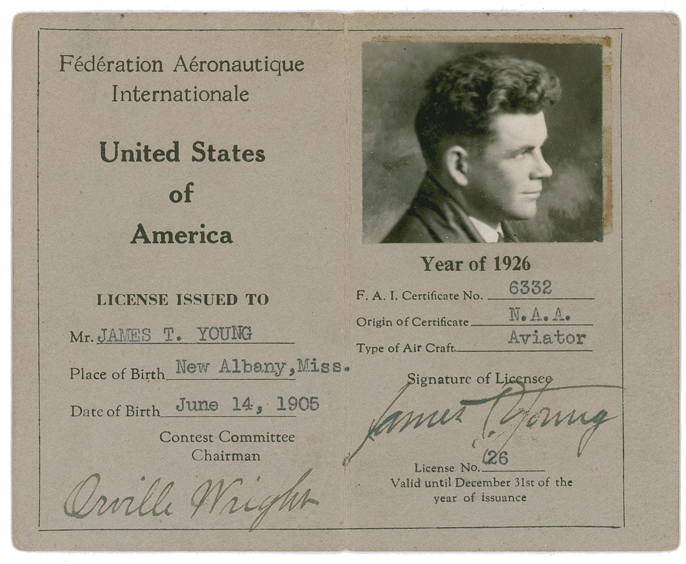 Pilot’s license, two pages, 5 x 4 opened, 1926. A Federation Aeronatique Internationale United States Annual License, #26, issued to James T. Young of New Albany, Mississippi, signed in black ink under the pilot’s personal information “Orville Wright,” as Chairman of the N. A. A. Contest Committee. License also includes a small snapshot of Young, and official information. In fine condition, with embossed seal lightly affecting Wright’s signature.