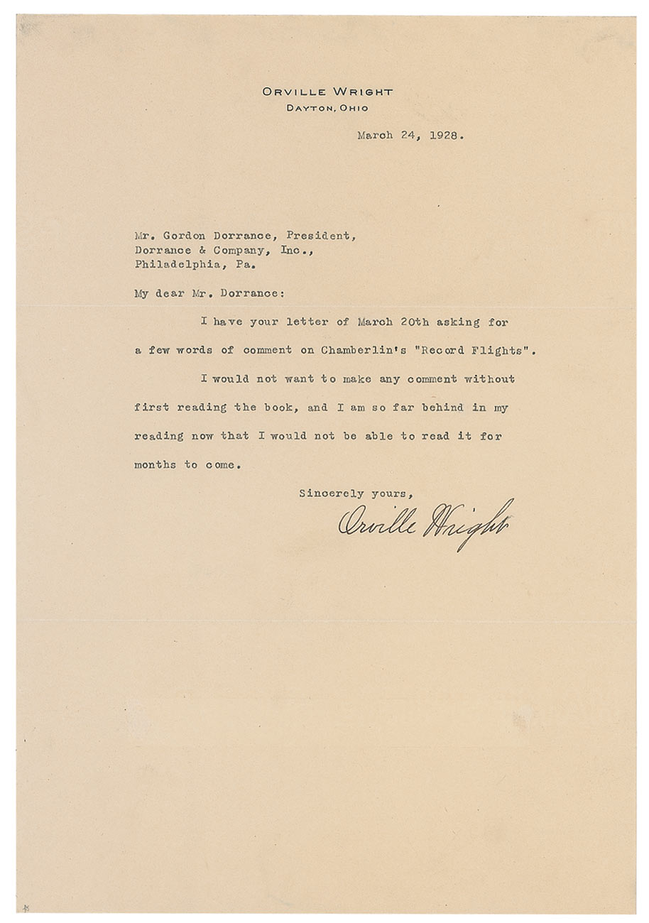 TLS, one page, 7.25 x 10.5, personal letterhead, March 24, 1928. Letter to Gordon Dorrance, president of Dorrance and Company. In full: “I have your letter of March 20th asking for a few words on Chamberlin’s ‘Record Flights.’ I would not want to make any comment without first reading the book, and I am so far behind in my reading now that I would not be able to read it for months to come.” In fine condition.