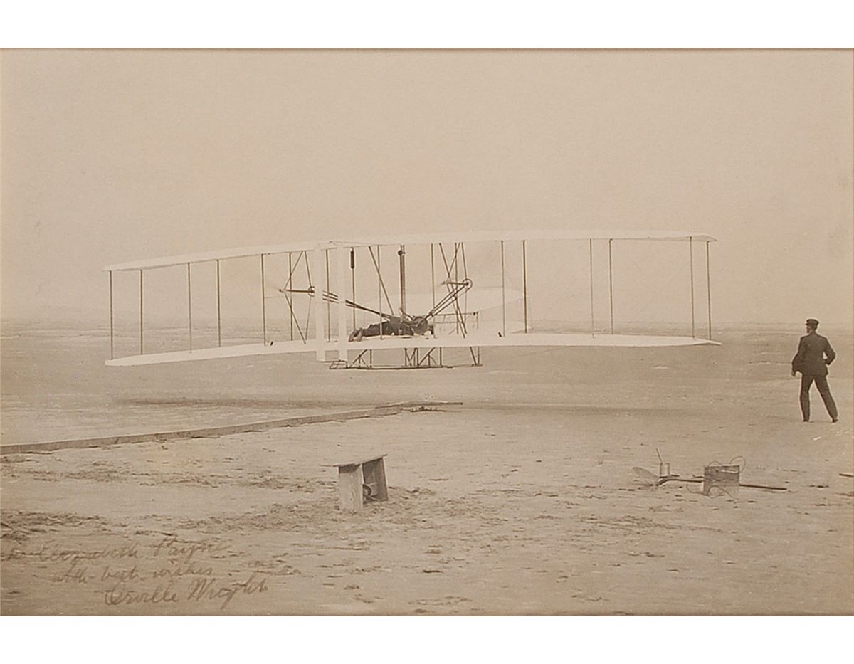 On December 17, 1903, Orville Wright piloted the first powered airplane 20 feet above a wind-swept North Carolina beach in a flight lasting 12 seconds and covering 120 feet. That brief trip skyward earned the brothers throngs of admirers including their cousin, whom the brothers bestowed with this remarkable image…one that is more than twice the size of the more common, but still scarce, ‘first flight’ signed photos. An exceptionally desirable image, with outstanding association; just a handful of these oversized images have ever appeared at auction.