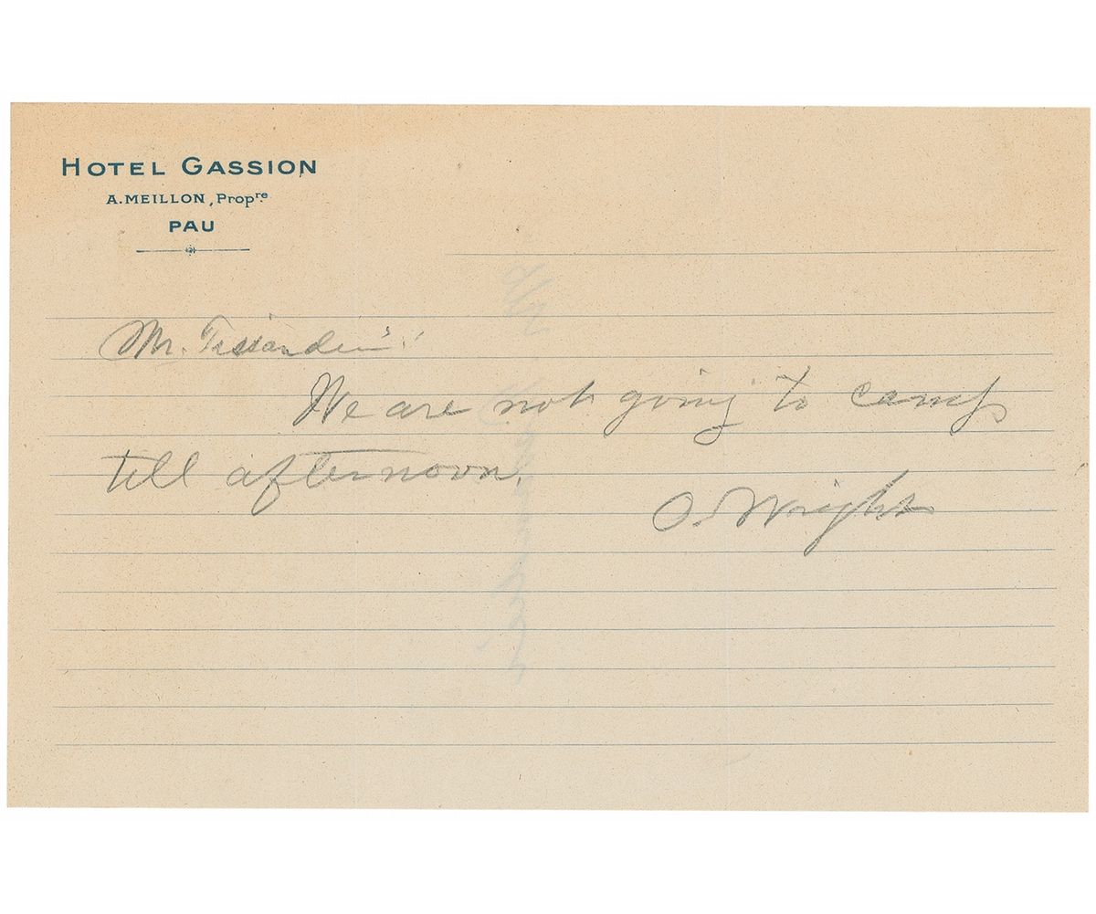 Four items: ALS in pencil signed “O. Wright,” one lightly-lined page, 8.25 x 5.5, Hotel Gassion letterhead. Wright writes to his student, Mr. Tissandier, in full: “We are not going to camp till afternoon”; and three vintage pearl-finish photos, ranging in size from 3.25 x 4.5 to 6.5 x 4.75, one featuring Wilbur Wright, Mr. Tissandier, and two unidentified men; one capturing Orville Wright teaching Count de Lambert how to fly as Paul Tissandier looks on; and the third of Mr. Tissandier and an unidentified man standing by the plane. In very good condition, with two vertical creases and light toning to the letter, and some mild creasing and silvering to the photos.
