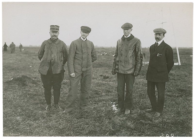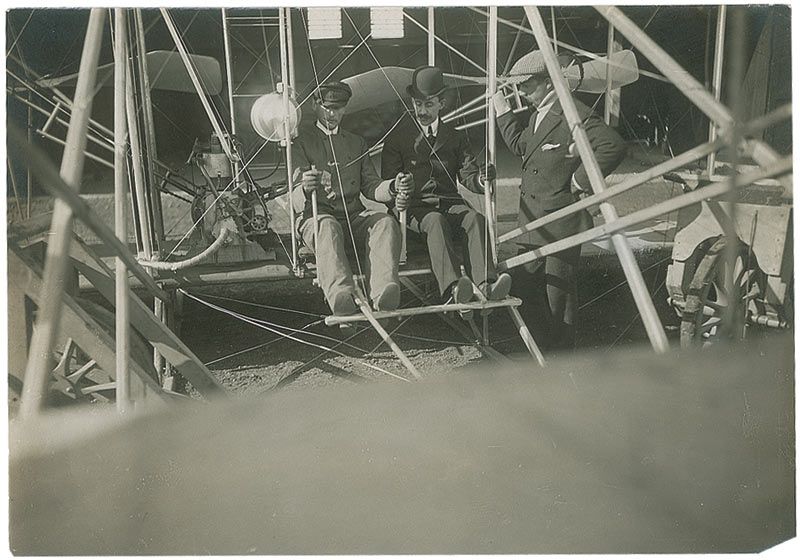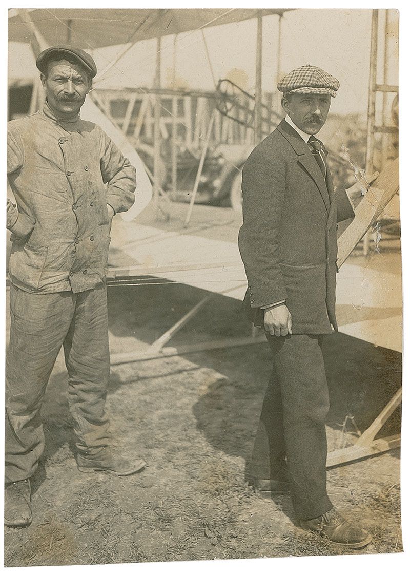 M. Paul Tissandier was the Wright brothers’ student pilot at Pau in the south of France, where they spent the spring of 1909. Pau, a posh resort town at the foot of the Pyrenees, was once a favorite vacation spot of King Edward VII, but tourism fell sharply when the king began to take a liking to Biarritz instead. Seeking a new attraction for tourists, Pau recruited the Wrights to fly at Pont-Long, where Wilbur made 64 flights and trained the first French airmen between February and March 1909. Orville and Katharine were given complimentary lodgings in a sumptuous hotel, the Hotel Gassion, while Wilbur slept in the flying shed, his meals provided by a French chef selected by the mayor. A splendid grouping from the Wrights’ sojourn, with a truly exceptional photograph of Wilbur teaching Tissandier how to pilot the Wright Flyer.