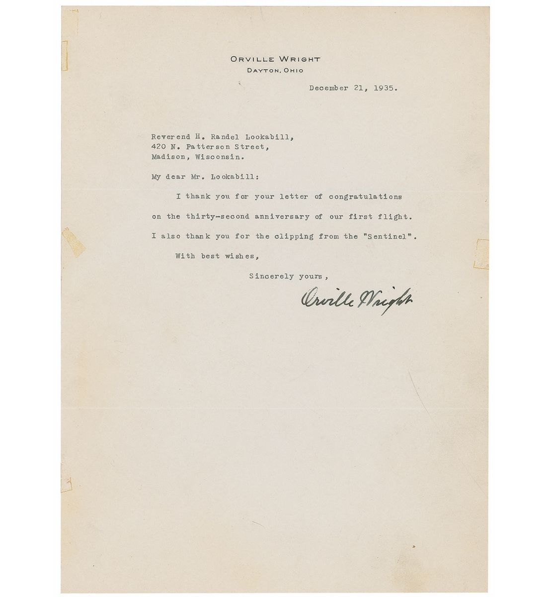 TLS, one page, 7.25 x 10, personal letterhead, December 21, 1935. Brief letter to Reverend H. Randel Lookabill. In full: “I thank you for your letter of congratulations on the thirty-second anniversary of our first flight. I also thank you for the clipping from the ‘Sentinel.’” In fine condition, with small mounting remnants and toning to edges. Accompanied by the original mailing envelope. A boldly signed example.
