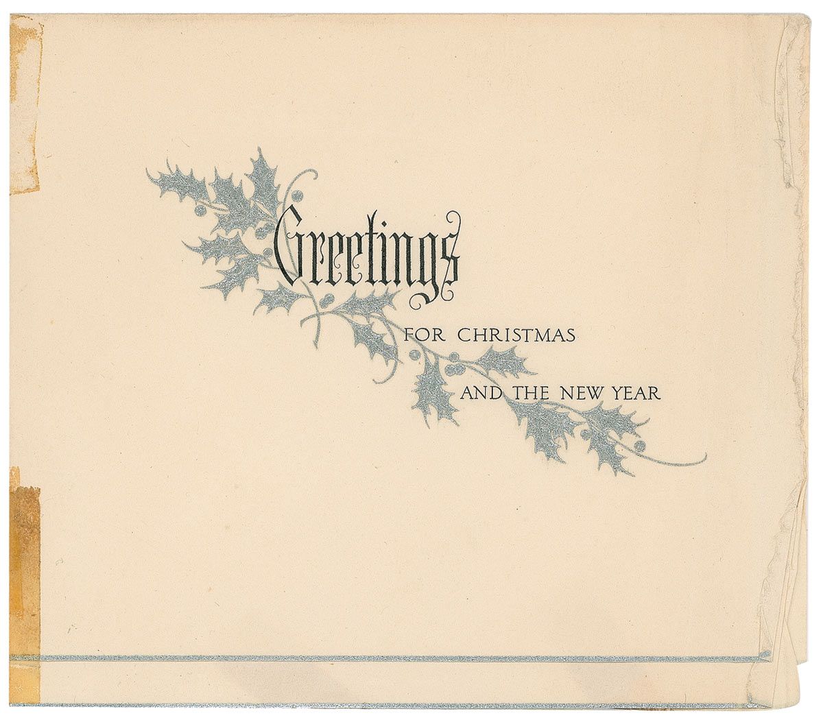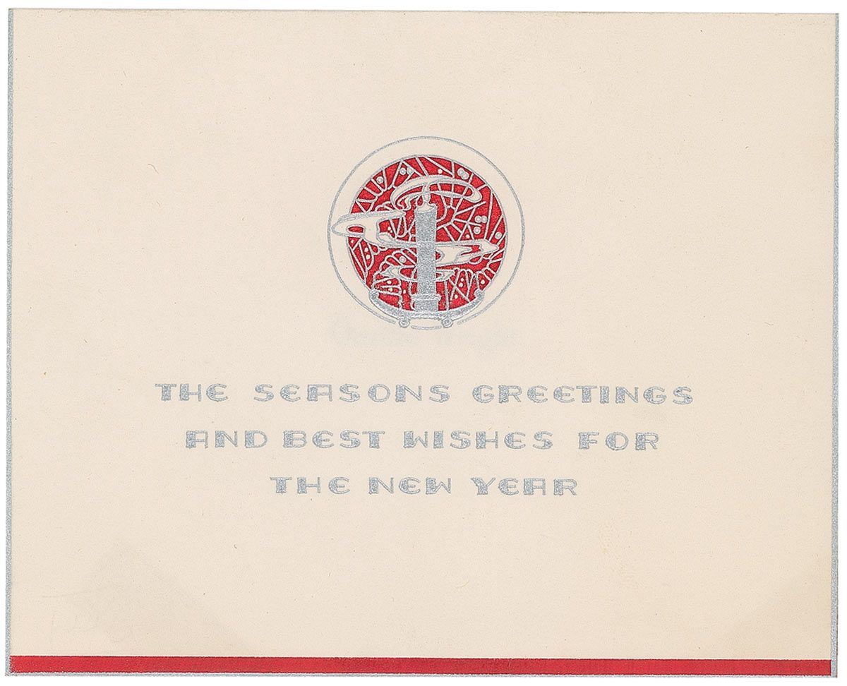 Two original unsigned Christmas cards from Orville Wright. The first card measures 5 x 4 closed, with an embossed Christmas candle on front with text in silver: “The Season’s Greetings and Best Wishes for the New Year,” with the inside bearing Wright’s name embossed in type; the second card measures 6.25 x 5.5 closed, engraved on the front over embossed silver holly: “Greetings for Christmas and the New Year,” with Wright’s name embossed in type inside. In very good condition, with two areas of tape toning to bottom of first card, and scattered creases and tape remnants to second card. Cards originate from the collection of Rev. H. Randel Lookabill of Dayton, Ohio, and Greenville, Indiana.