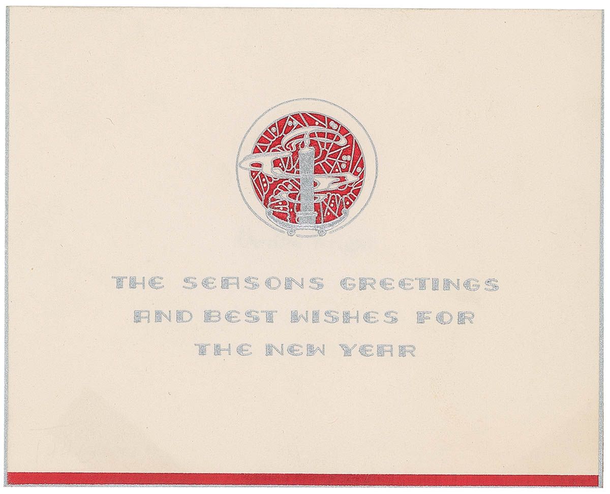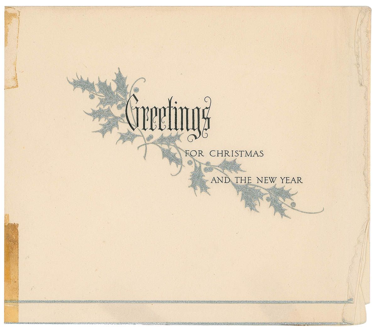 Two original unsigned Christmas cards from Orville Wright. The first card measures 5 x 4 closed, with an embossed Christmas candle on front with text in silver: “The Season’s Greetings and Best Wishes for the New Year,” with the inside bearing Wright’s name embossed in type; the second card measures 6.25 x 5.5 closed, engraved on the front cover with embossed silver holly: “Greetings for Christmas and the New Year,” with Wright’s name embossed in type inside. In very good condition, with two areas of tape toning to bottom of first card, and scattered creases and tape remnants to second card. Cards originate from the collection of Rev. H. Randel Lookabill of Dayton, Ohio, and Greenville, Indiana.