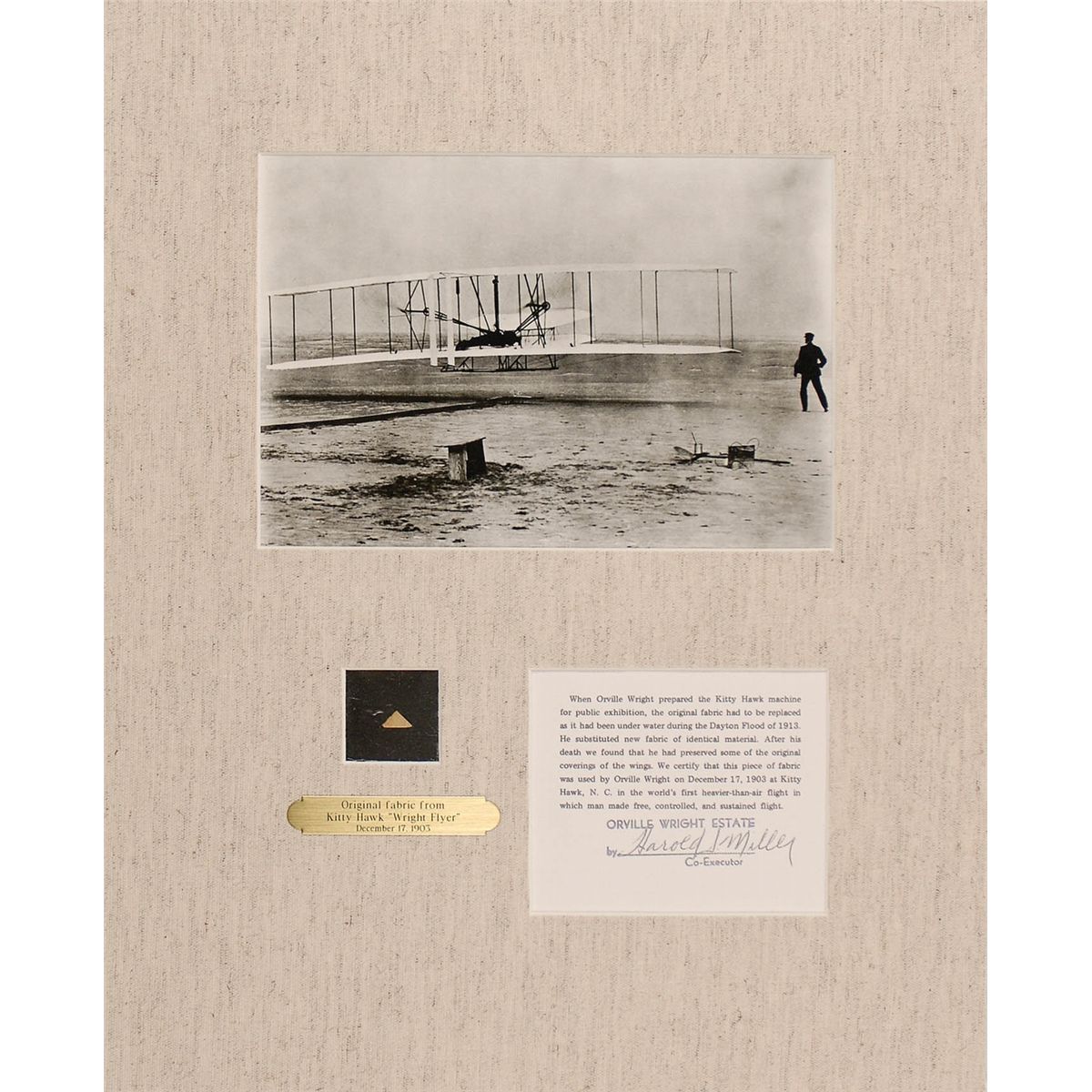 Original .25 x .25 triangular portion of the original wing covering fabric used by Orville Wright during the world’s first flight at Kitty Hawk. Cloth matted with a photo of the flight, a descriptive plaque, and a reproduction of the original statement of authenticity (which was originally signed by a co-executor of the Orville Wright estate, Harold S. Miller), to an overall size of 14.5 x 18. The copy of the statement of authenticity reads, in full: “When Orville Wright prepared the Kitty Hawk machine for public exhibition, the original fabric had to be replaced as it had been under water during the Dayton Flood of 1913. He substituted new fabric of identical material. After his death we found that he had preserved some of the original coverings of the wings. We certify that this piece of fabric was used by Orville Wright on December 17, 1903 at Kitty Hawk, N. C. in the world’s first heavier-than-air flight in which man made free, controlled, and sustained flight.” In fine condition. A great piece of aviation history!