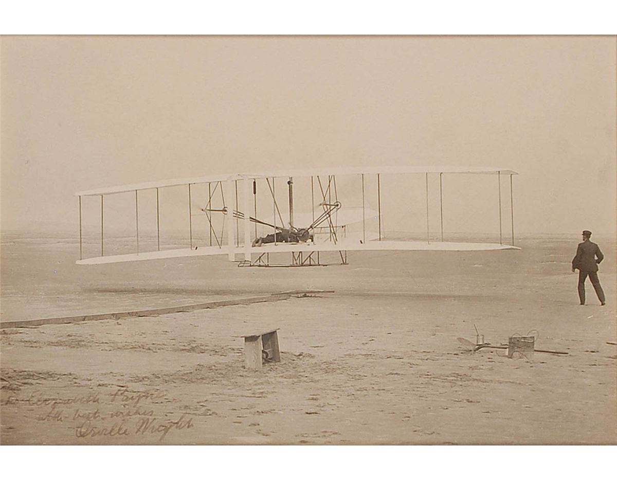 On December 17, 1903, Orville Wright piloted the first powered airplane 20 feet above a wind-swept North Carolina beach in a flight lasting 12 seconds and covering 120 feet. That brief trip skyward earned the brothers throngs of admirers including their cousin, whom the brothers bestowed with this remarkable image…one that is more than twice the size of the more common, but still scarce, ‘first flight’ signed photos. An exceptionally desirable image, with outstanding association; just a handful of these oversized images have ever appeared at auction.