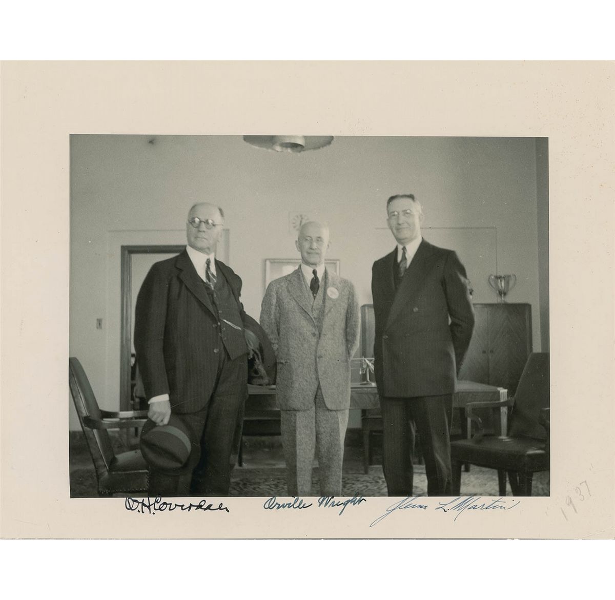 Vintage matte-finish 10.75 x 8.5 photo of Orville Wright posing between Glenn Martin and William H. Coverdale, signed in the lower border in fountain pen, “Orville Wright,” “Glenn L. Martin,” and “W. H. Coverdale.” A pencil date notation of “1937” has been added in an unknown hand to the lower right. Some light creases to corners and edges, a bit of light silvering, visible only at an angle, surface impression to lower right of image, and a few light surface dings, otherwise fine condition. On December 17, 1937, on the 34th anniversary of man’s first powered flight at Kitty Hawk, the Associated Press reported from New York that Orville Wright ‘made one of his rare trips away from his Dayton OH home to attend a meeting of the Institute of Aeronautical Sciences.’ Coverdale was almost certainly one of the several hundred attendees at the December 17, 1937, meeting of the Institute of Aeronautical Sciences, at which Glenn L. Martin was also present. This photograph was most probably taken that day. Orville Wright is wearing a circular button on his left lapel which may identify him as the ‘guest of honor.’ Research has been unable to find any record of a sale at major public auction of a photograph signed by both Wright and Glenn L. Martin.