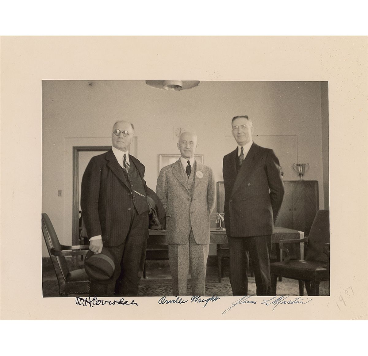 Vintage matte-finish 10.75 x 8.5 photo of Orville Wright posing between Glenn Martin and William H. Coverdale, signed in the lower border in fountain pen, “Orville Wright,” “Glenn L. Martin,” and “W. H. Coverdale.” A pencil date notation of “1937” has been added in an unknown hand to the lower right. Some light creases to corners and edges, surface impression to lower right of image, and a few light surface dings, otherwise fine condition. On December 17, 1937, on the 34th anniversary of man’s first powered flight at Kitty Hawk, the Associated Press reported from New York that Orville Wright ‘made one of his rare trips away from his Dayton OH home to attend a meeting of the Institute of Aeronautical Sciences.’ Coverdale was almost certainly one of the several hundred attendees at the December 17, 1937, meeting of the Institute of Aeronautical Sciences, at which Glenn L. Martin was also present. This photograph was most probably taken that day. Orville Wright is wearing a circular button on his left lapel which may identify him as the ‘guest of honor.’ Research has been unable to find any record of a sale at major public auction of a photograph signed by both Wright and Glenn L. Martin.